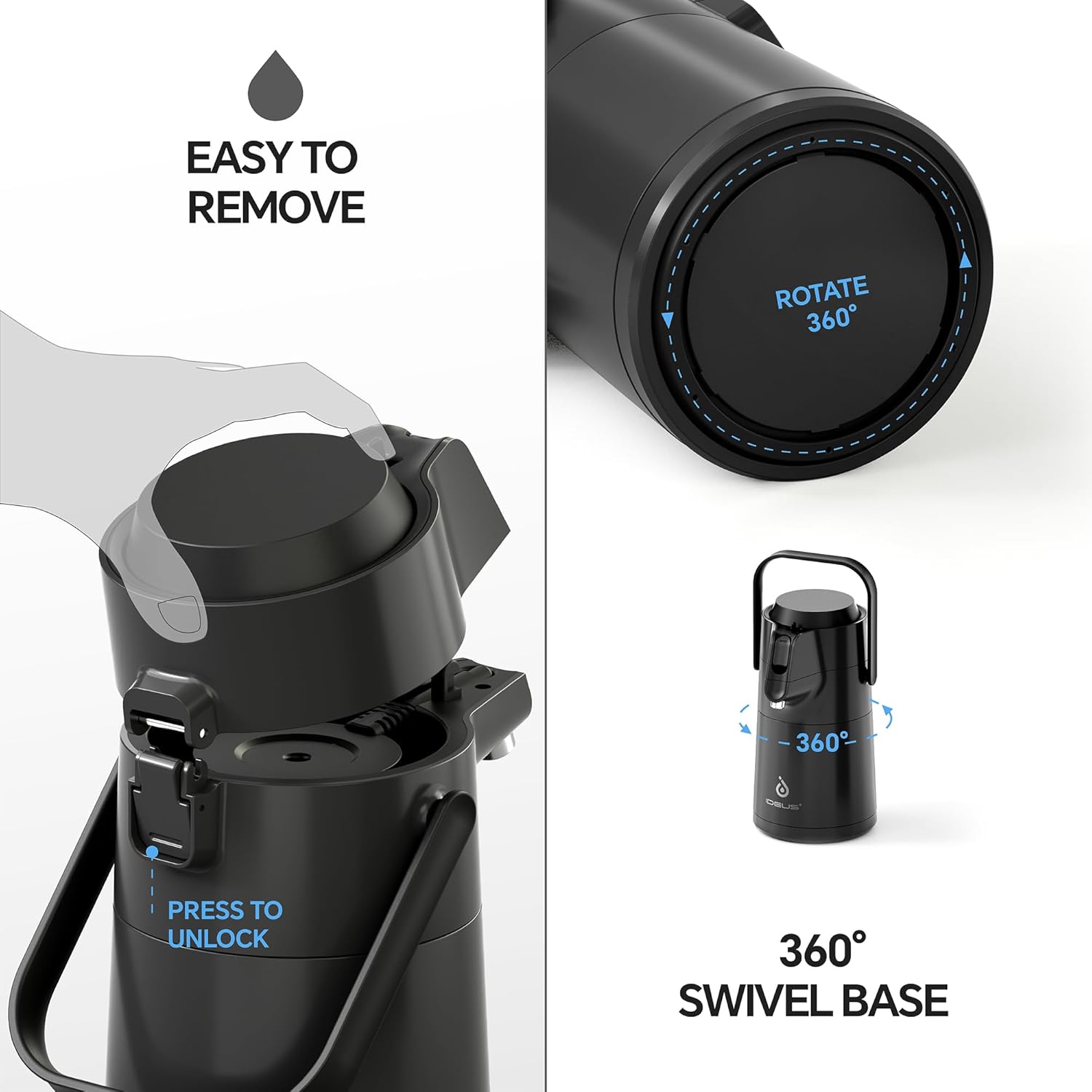 IDEUS Thermal Coffee Carafe 74oz (2,200ml), Stainless Steel Double Wall Insulated Vacuum Flask, Water Jug Coffee Server and Beverage Dispenser, Heat and Cold Retention (Black, 74oz (2,200ml))