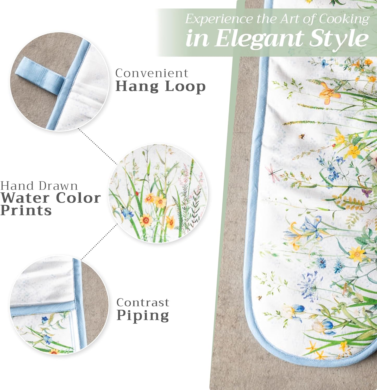 Maison d' Hermine Double Oven Mitts 100% Cotton 7"x35" Double Oven Mitt Heat Resistant BBQ Cooking Gloves with Loop, Baking, Grilling, Home, Kitchen, Handling Hot Pans Spring Summer (Fleurs De Mai)