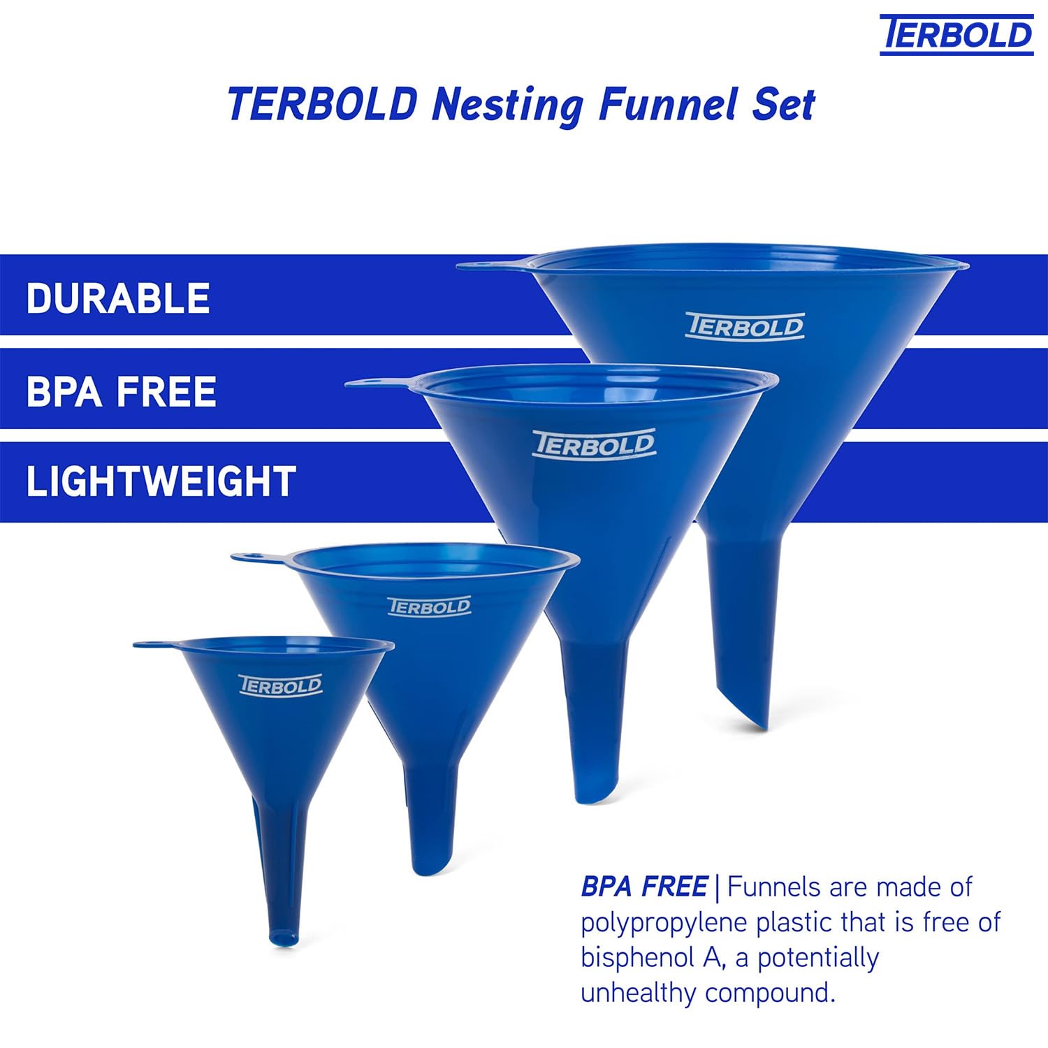 - NESTING DESIGN | All four funnels nest together, so the set requires minimal room in your kitchen drawer, utility shelf, or toolbox