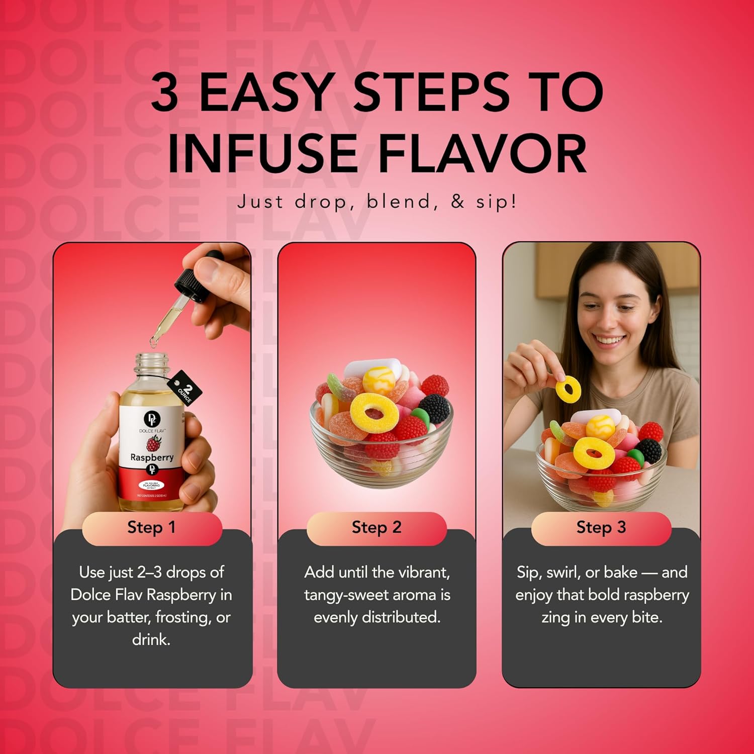 - Mastering Raspberry-Infused Confections: With our pure raspberry essence, you can achieve a full-bodied raspberry flavor in every candy and dessert, from tangy raspberry gummies to mouthwatering frostings.