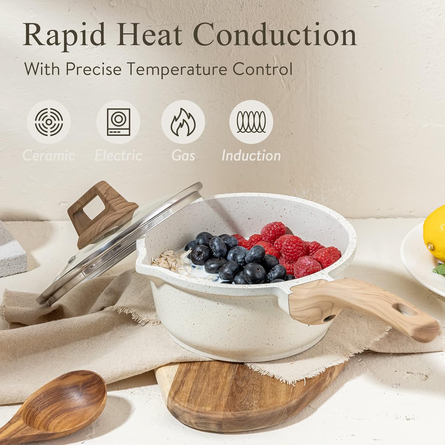 - [Perfect Addition for Everyday Cooking] - The wooden grip and white cream color add elegance to your home decor and is ergonomically designed for comfort. Introducing our innovative pouring spout design, making it easier than ever to pour oil or sauce with precision. Whether making oatmeal, soups, sauces, or gravies, this lightweight saucepan has got you covered.