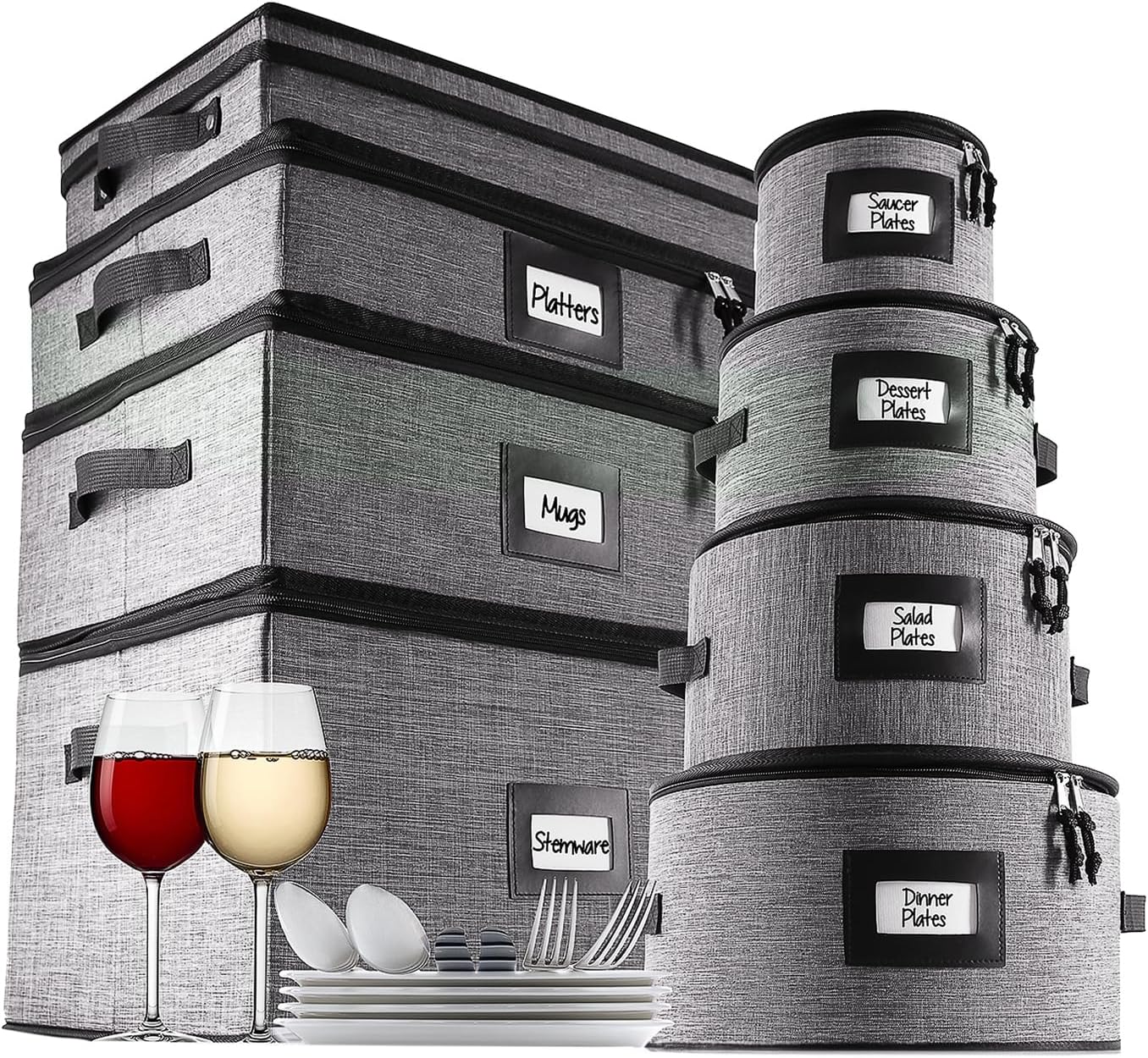 Fine China Storage Containers, 8 Piece Quilted Dish Storage Containers for Flatware & Utensil, Mug, Platter and Wine Glass with Felt Dividers, Durable Dinnerware Dish Organizers for Moving, Grey