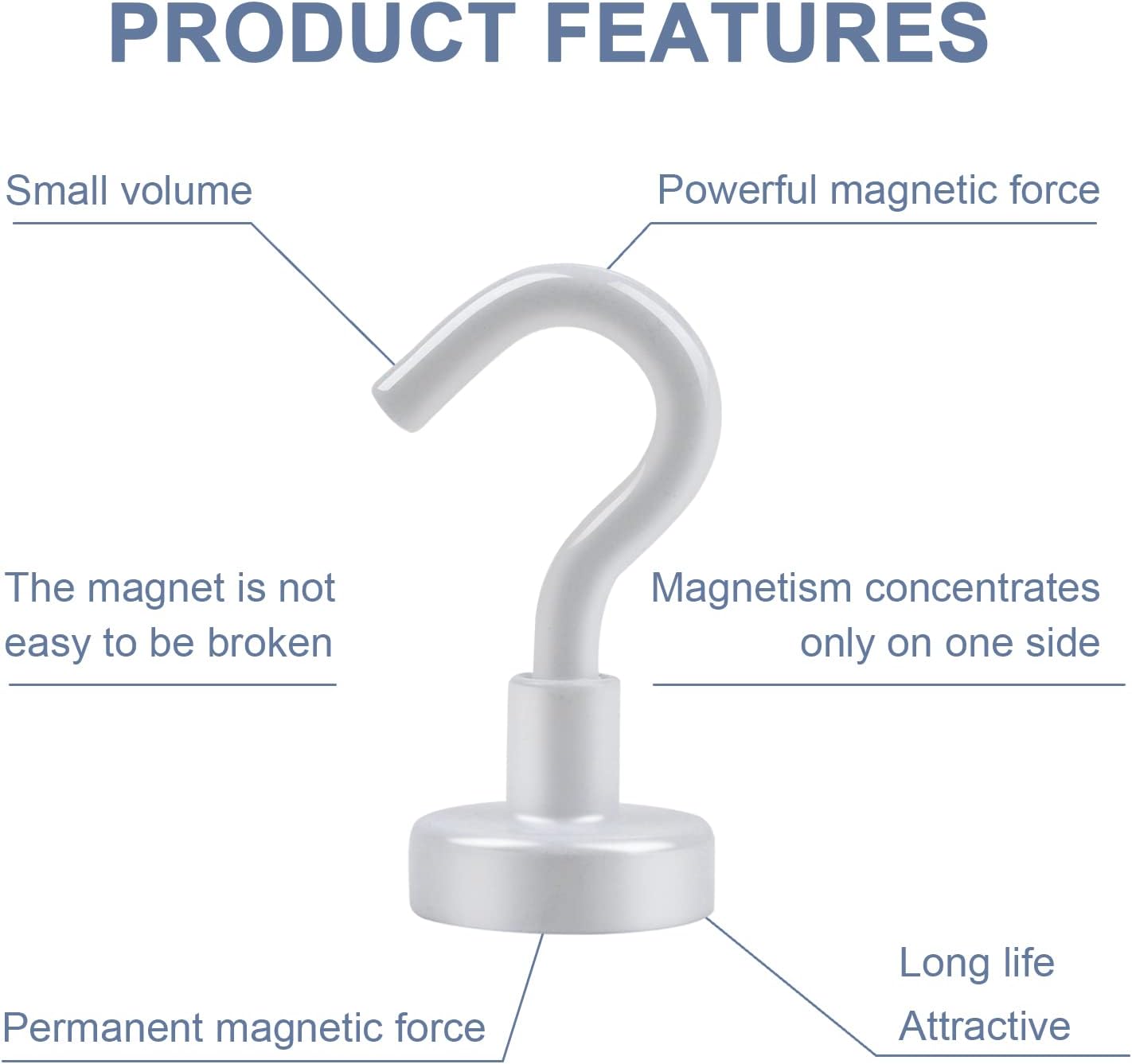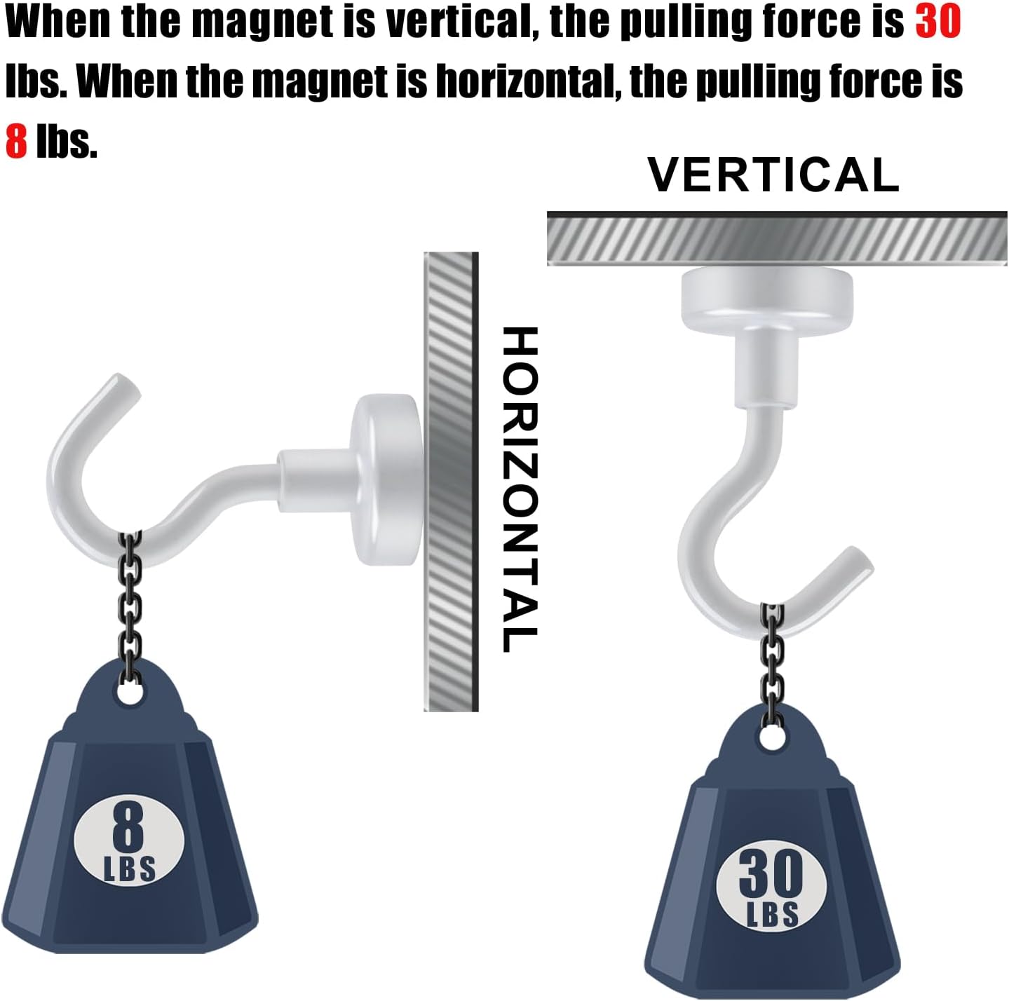 - POWERFUL & DURABLE:We provide 3 layers of coating on the metal base, metal hook and magnet: Ni-Cu-Ni, so our magnet hooks have excellent anti-corrosion and scratch resistance. The magnetic hooks use high-quality neodymium magnets, which provide a strong magnetic force and can hang items weighing up to 30 pounds
