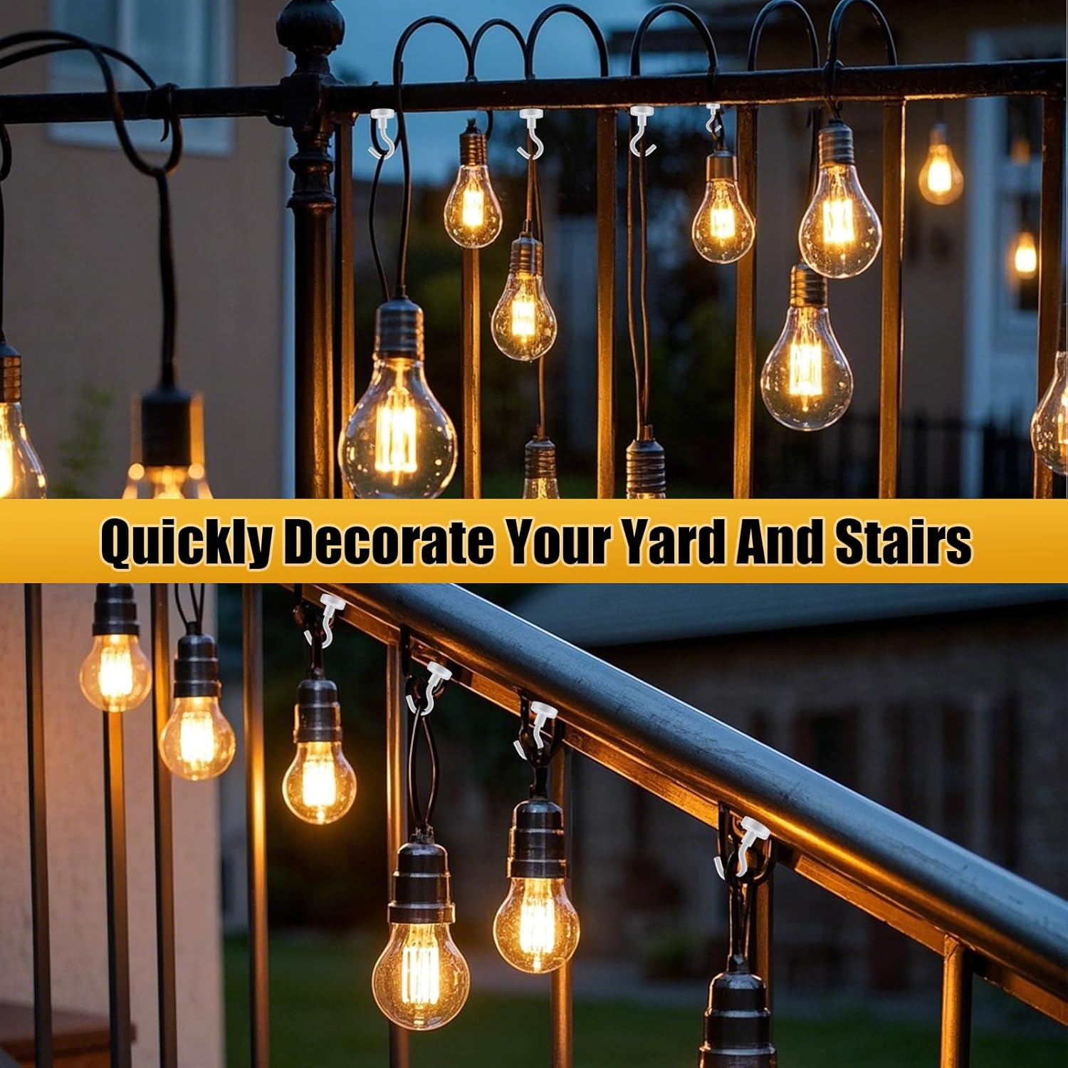 - WIDELY USED: Our outdoor light hooks are ideal for Christmas lights, patio parties, and other outdoor activities. They can be used to hang garden lights, holiday lights, solar light strings, LED light strings, Christmas decorations, Halloween decorative lights, LED rope lights and other lighting decorations on balconies, fences, cabins, decks, stair railings, roof eaves, etc