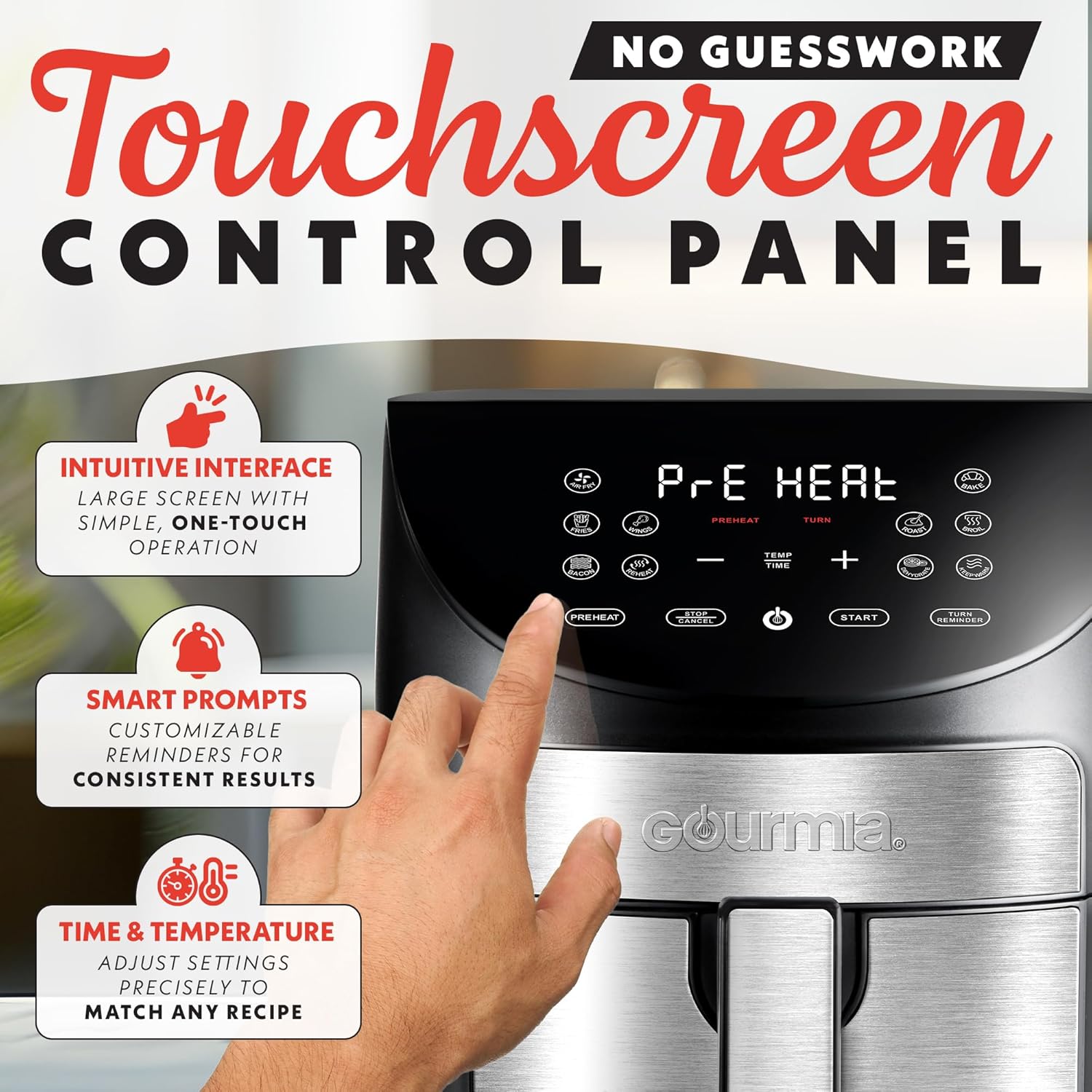 Gourmia Digital Air Fryer – 7 QT, FryForce 360° Technology, 10 Presets, Guided Cooking Prompts, Auto Shut-Off, Dishwasher Safe Basket, 1500W, black/Stainless Steel