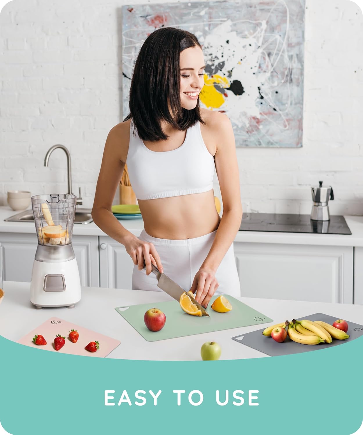 - π§Ό EASY TO CLEAN, DRY & STORE! Π‘utting boards for kitchen use are just what youβve been looking for! The compact design of our 3 piece mat board set takes the load out of cooking. Chop, slice, and dice confidently with cutting mats for cooking that are sure to stay in place as you prep.