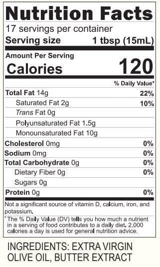 - 1 Glass Bottle of Blazing Bella Butter Infused Olive Oil. 250 ML (8.45 Fl Oz) includes built in pour spout so that you can get the right amount out with every pour.