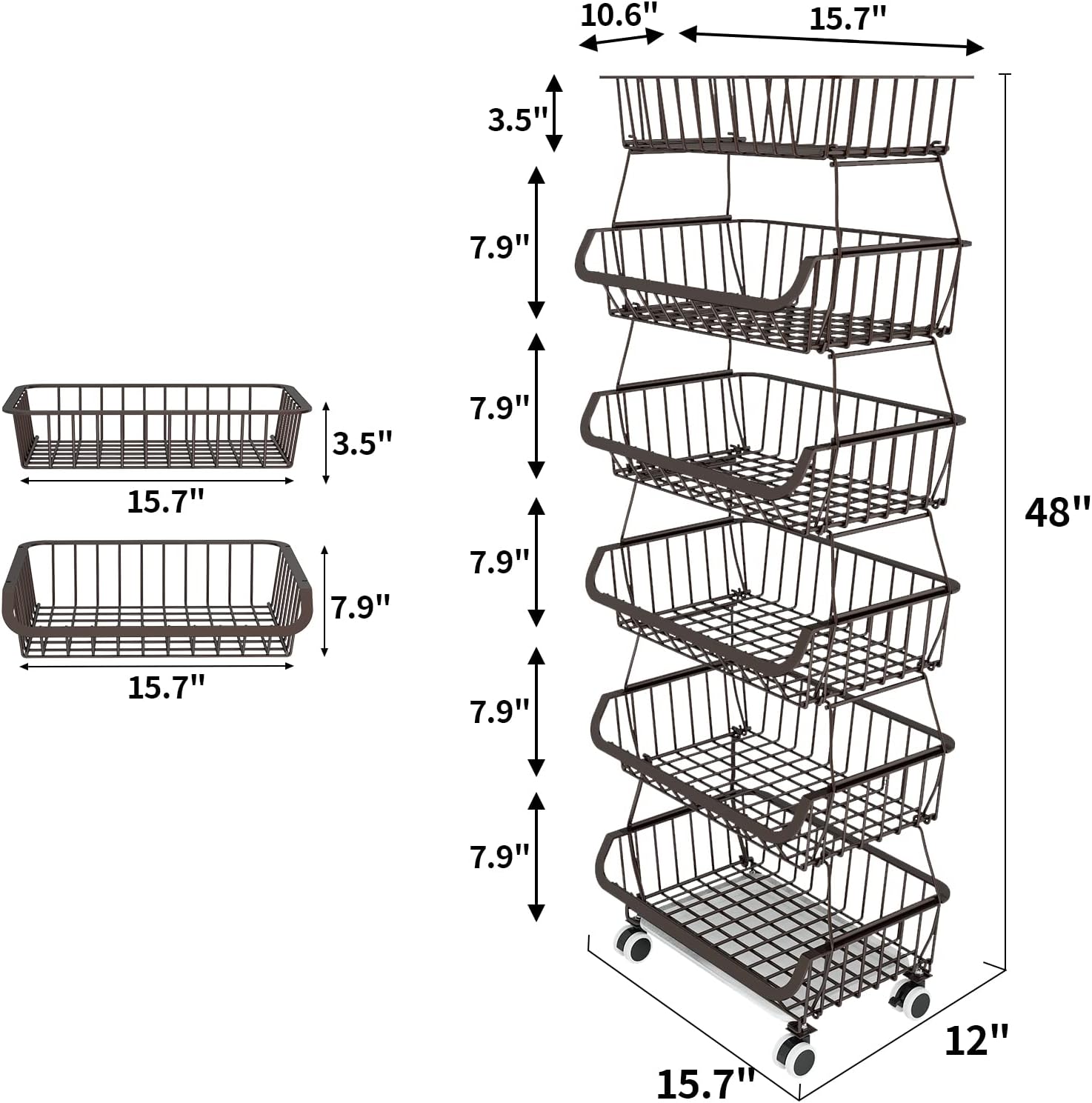 - 【6 Tier Stackable Storage Basket】Each layer of baskets can be stackable and detachable, which allow to combine the baskets freely in 1 to 6 tiers to match the height you need.Equipped with 4 non-slip foot pads and 4 floor universal wheels,you can use wheels to move on the floor or use foot pads to fix on the countertop.