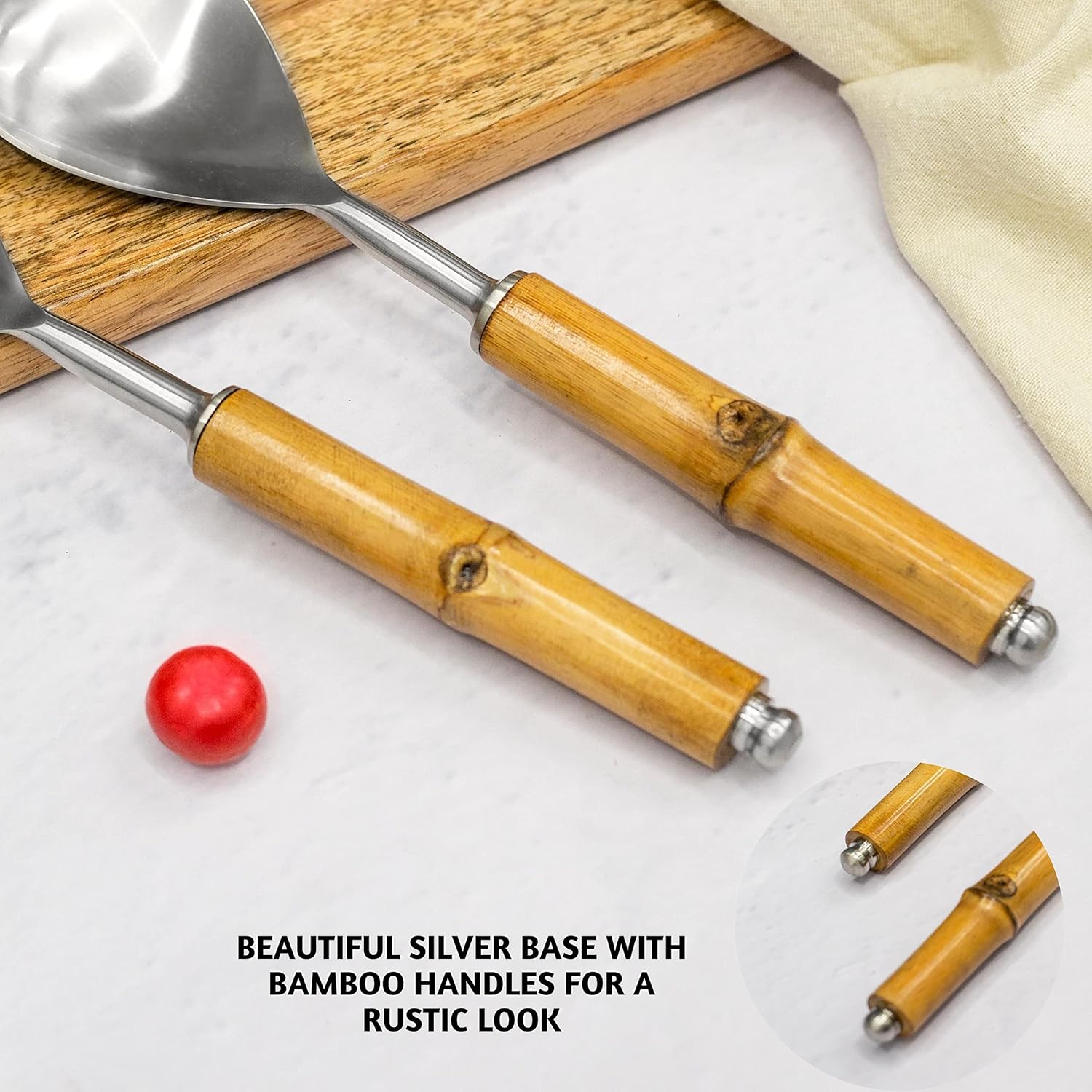 - UNIQUE DESIGN - The silver salad servers or salad hands have ergonomically designed wide handles handcrafted in bamboo that makes for a comfort grip. It is heat resistant and stays cool while cooking, serving or mixing. The shape of these serving spoons and salad forks make them ideal for large salad bowls or serving bowls.