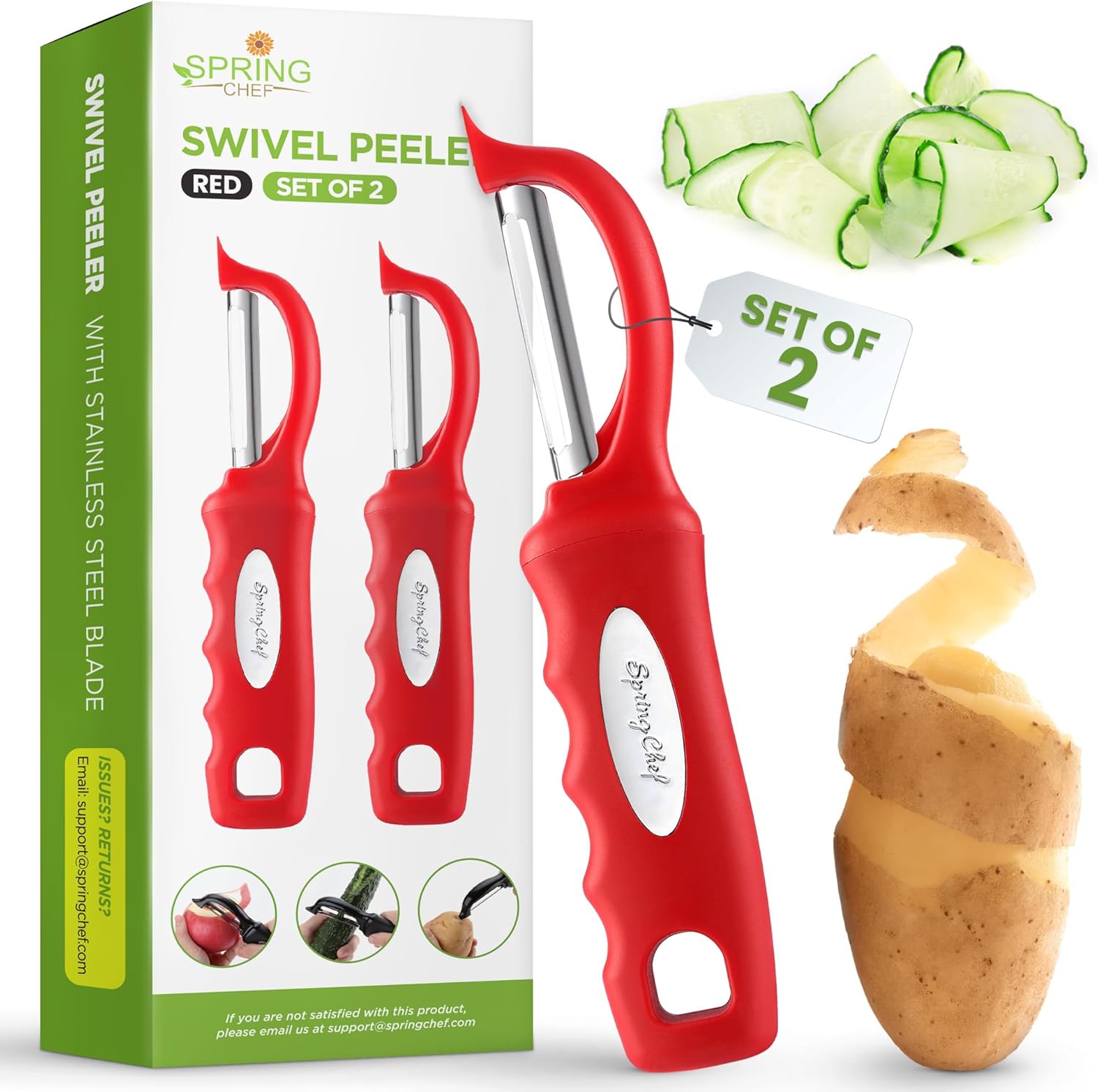 Spring Chef Professional Red Swivel Vegetable Peeler for Kitchen, Stainless Steel Potato Peelers with Soft Grip Handle, Perfect for Peeling Apple, Veggie, Fruit, Carrot, Dishwasher Safe - Set of 2