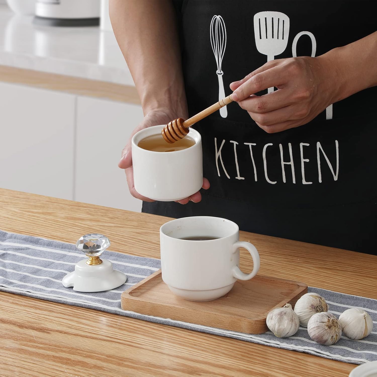 - CRYSTAL LID: This porcelain honey jar has this crystal lid, which provides two styles to choose from, it looks very high end atmosphere
