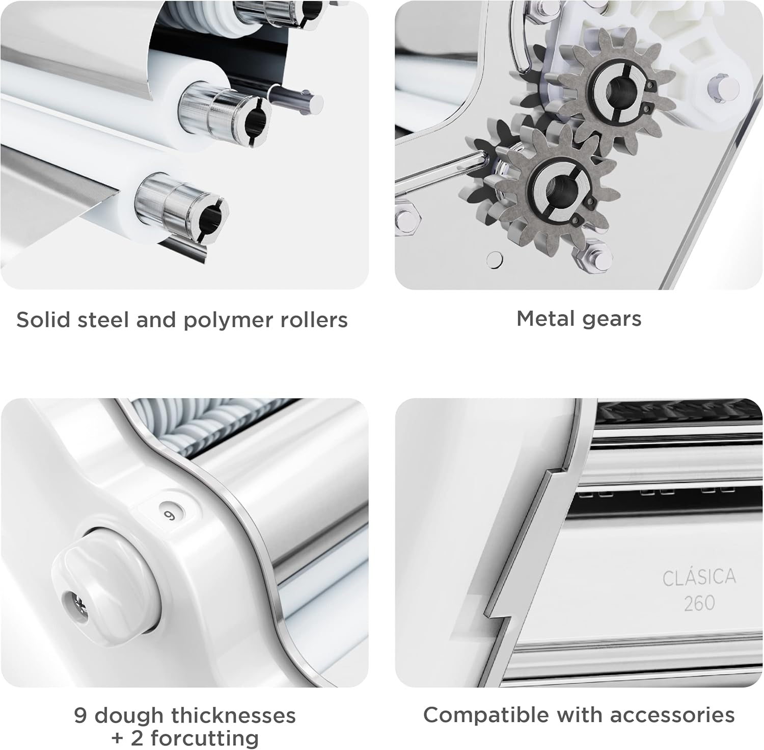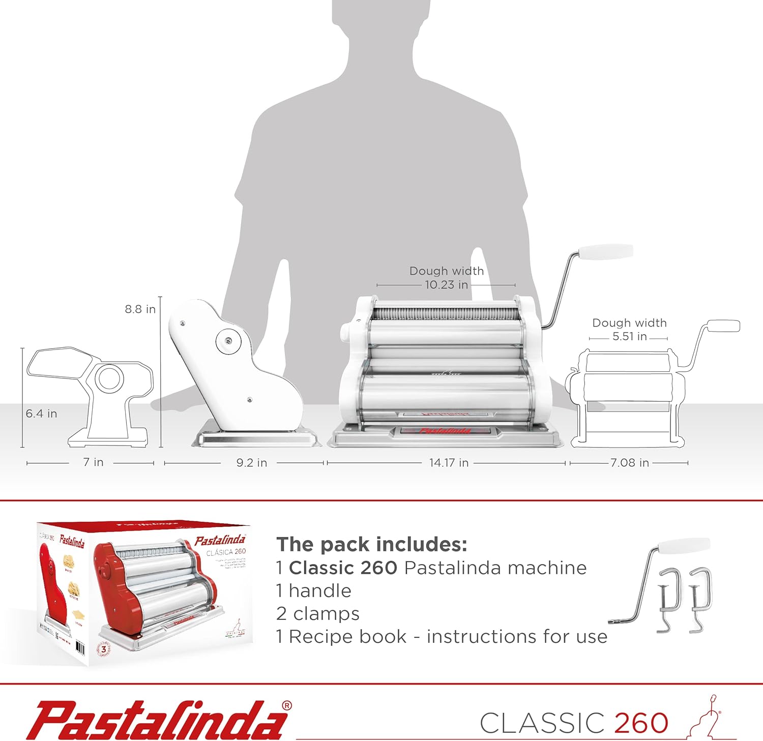 PASTALINDA Classic 260 Pasta Maker Machine, 26 cm Wide Rollers, 9 Thickness Positions, 2 Cutting Positions, Stainless Steel. Includes Reinforced Hand Crank And Two Clamps (White)