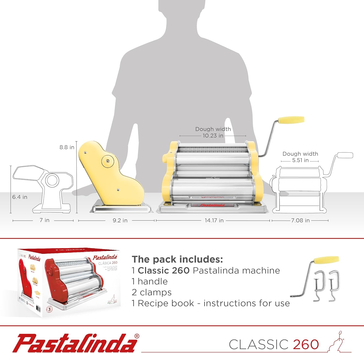 PASTALINDA Classic 260 Pasta Maker Machine, 26 cm Wide Rollers, 9 Thickness Positions, 2 Cutting Positions, Stainless Steel. Includes Reinforced Hand Crank And Two Clamps (Yellow)