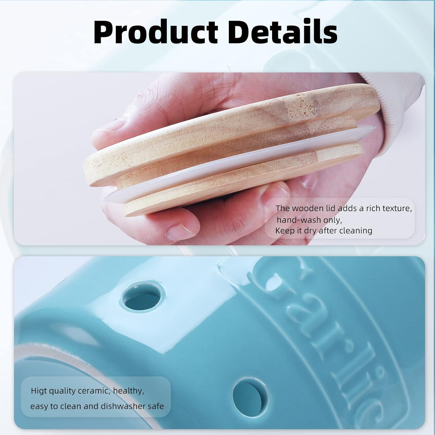 Large Garlic Keeper with Wooden Lid, Ceramic Garlic Holder Storage, Garlic Container for Kitchen, Garlic Saver to Keep Your Garlic Cloves Fresh Longer 4.5-Inch, Turquoise