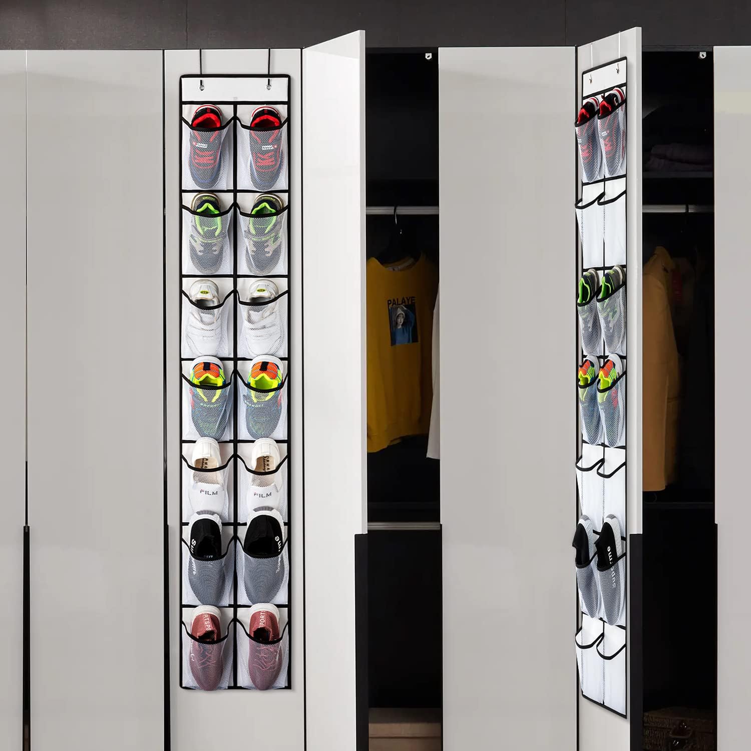 - â»ă28 Large Deep Pockets in Total ăEach door shoe organizer has 14 pockets , 28 Pockets in total. can hang 14 pairs of shoes at least and holding the shoes of your whole family.