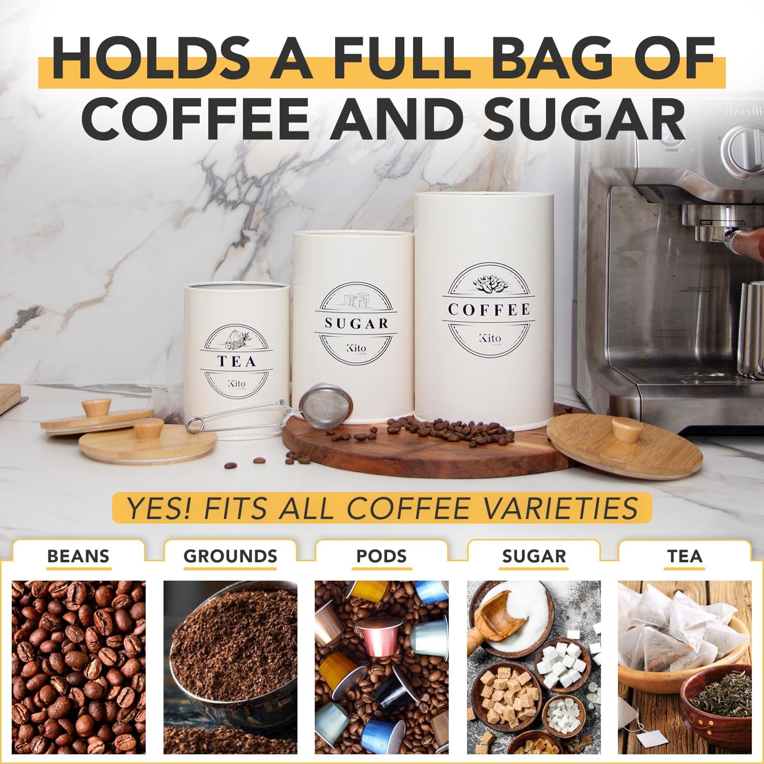 - SPACE SAVING AND STACKABLE: These airtight container canisters feature a stackable design so you can place them on your kitchen counters while saving space and keeping them organized. Each pack comes with a Sugar Canister, Tea Canister, and Coffee Canister