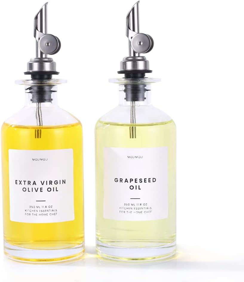 Molimoli Oil and Vinegar Dispenser with Metal Pour Spout, Weighted Pourer, Glass Bottle Dispenser for Kitchen, Olive Oil Cruet, Glass Olive Oil Bottle | 350ml, Set of 2