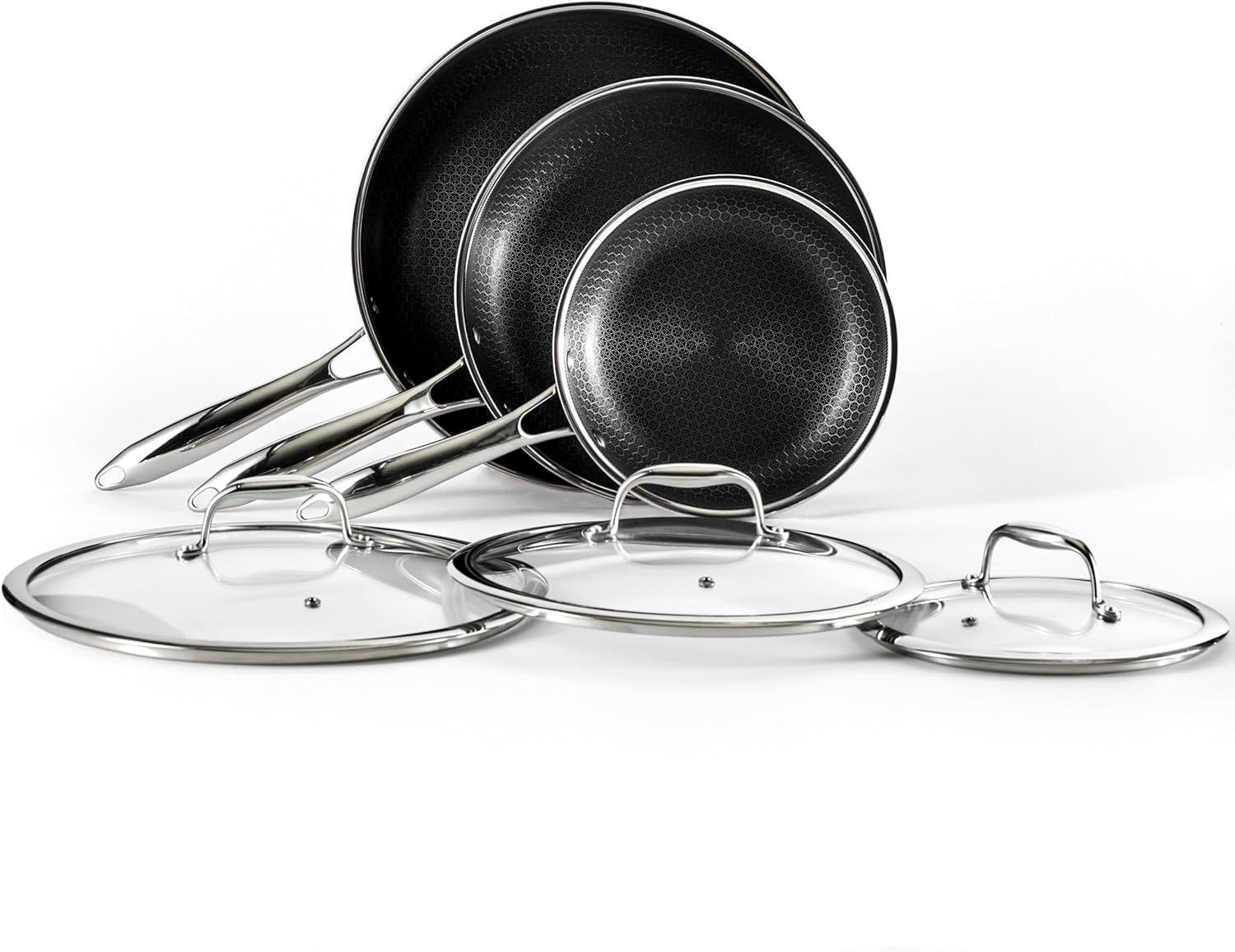HexClad Hybrid Nonstick 6-Piece Fry Pan Set, 8, 10, and 12-Inch Frying Pans with Tempered Glass Lids, Stay-Cool Handles, Dishwasher-Friendly, Induction Ready, Compatible with All Cooktops