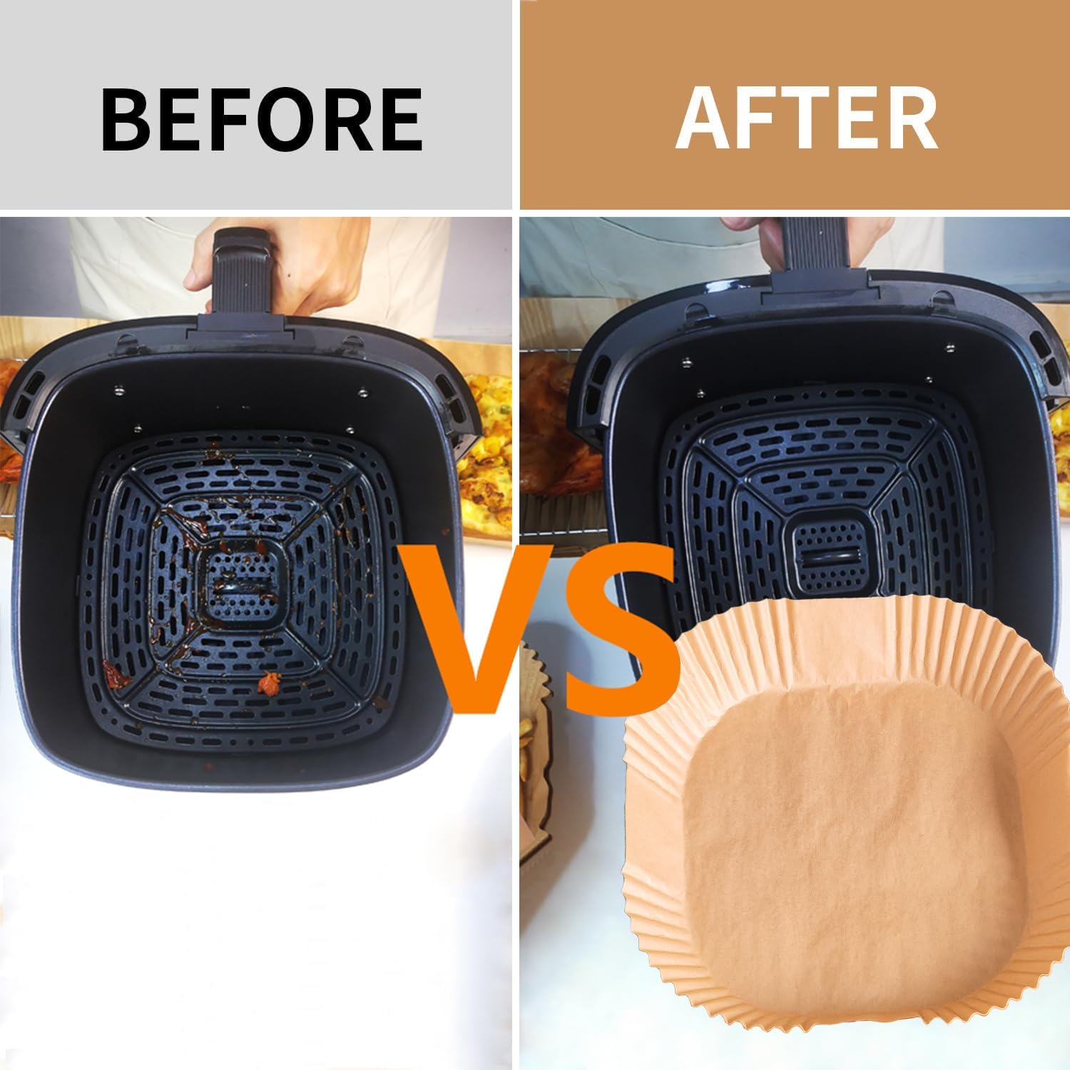 - ♡Will you operate? Our airfryer parchment liners doesn't need to tear, cut, or think about how to wrap the food, just take one out, put your food on it and put it in your air fryer. It can keep the original taste of food intact, and you don't have to worry about sticking! Simple operation can eat delicious food!