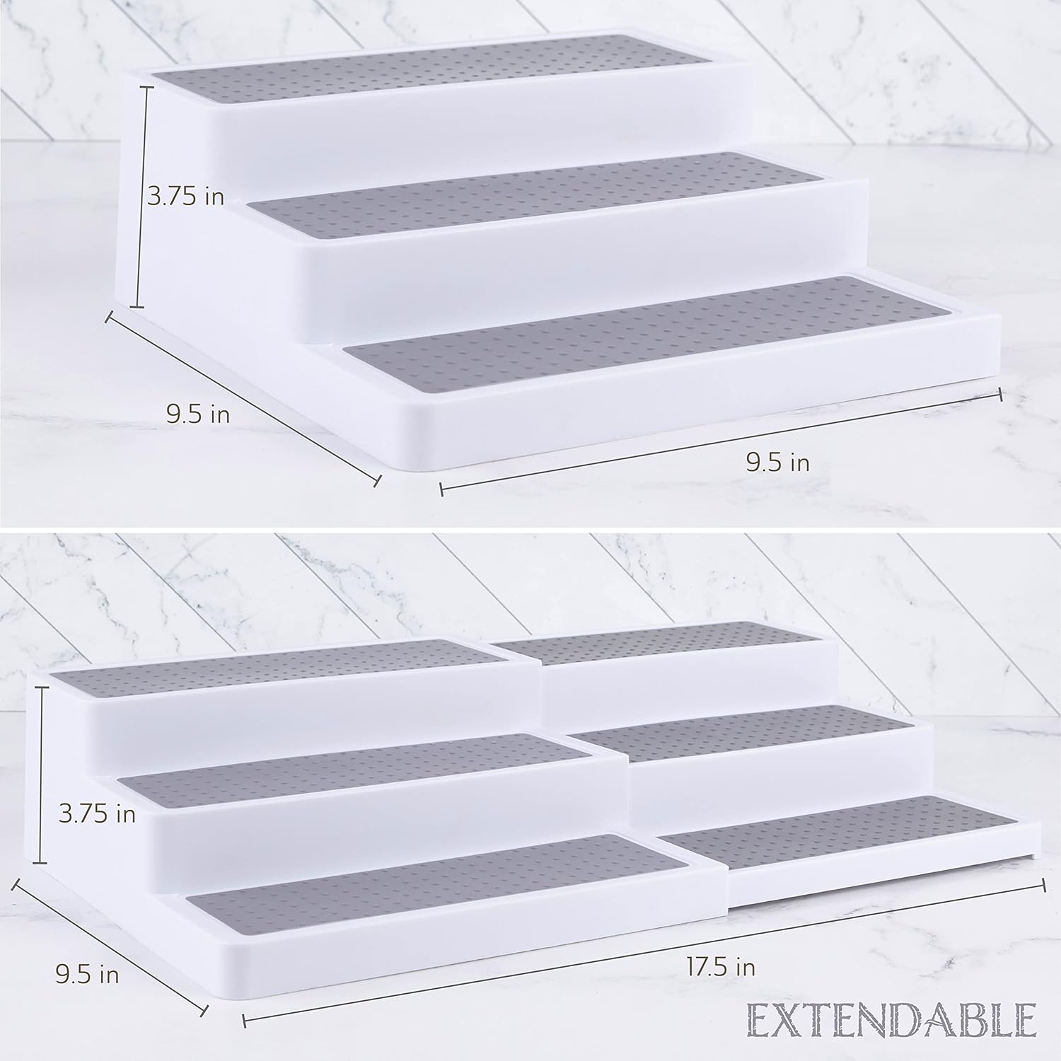 Oizeir 3–Tier Expandable Plastic Spice Rack - Adjustable Length, Stability with Non-Skid Shelf, Three Tiers for Easy Visibility, Organizer for Kitchen Cabinet, Pantry or Countertop, White/Grey