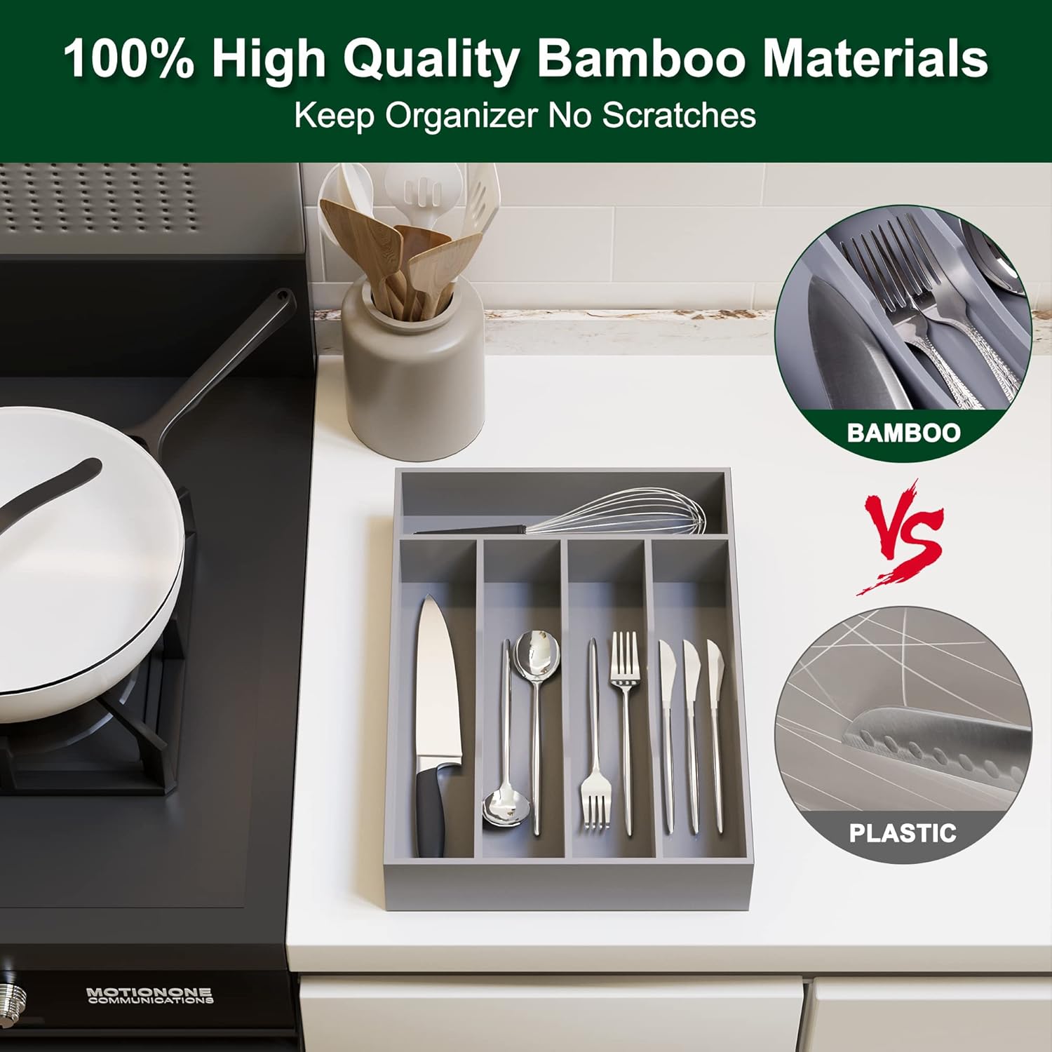 - â ăMADE OF NATURAL BAMBOOăOur flatware organizer is made of natural bamboo. The material is taken from bamboo that have grown for more than 4 years which make our silverware holder for drawer use a durable kitchen piece that ll last you for years. The Environmentally material keep our flatware & utensil water and odor resistant. Even the knife won't leave scratch on it.