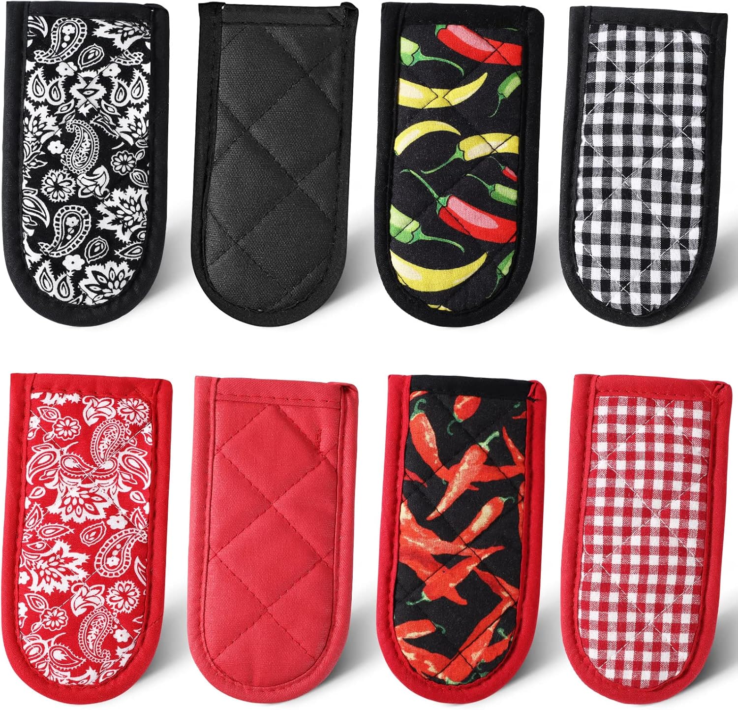 - Sufficient styles set: 4 styles of these non-slip pot sleeve grips for you to choose, include solid black color, black and white buffalo plaid, red base color with white stripe, black base with red pepper design, you can choose the styles you want to add touch to the kitchen cookware
