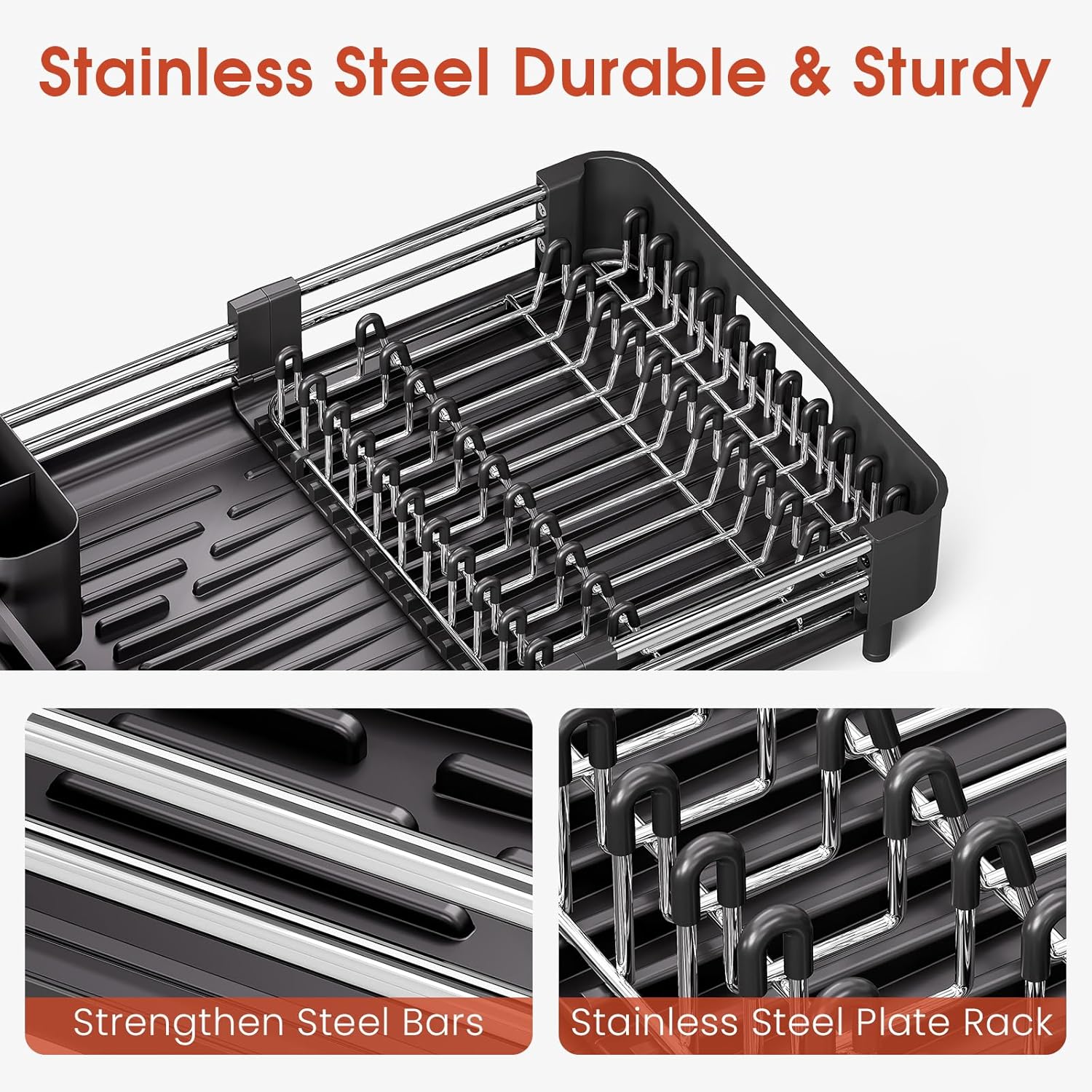 - PREMIUM QUALITY: The dish rack is made of high quality plastic and premium stainless steel tubes which can adjust the rack smoothly. The shiny polished surface and modern design make it perfect for any kitchen decoration