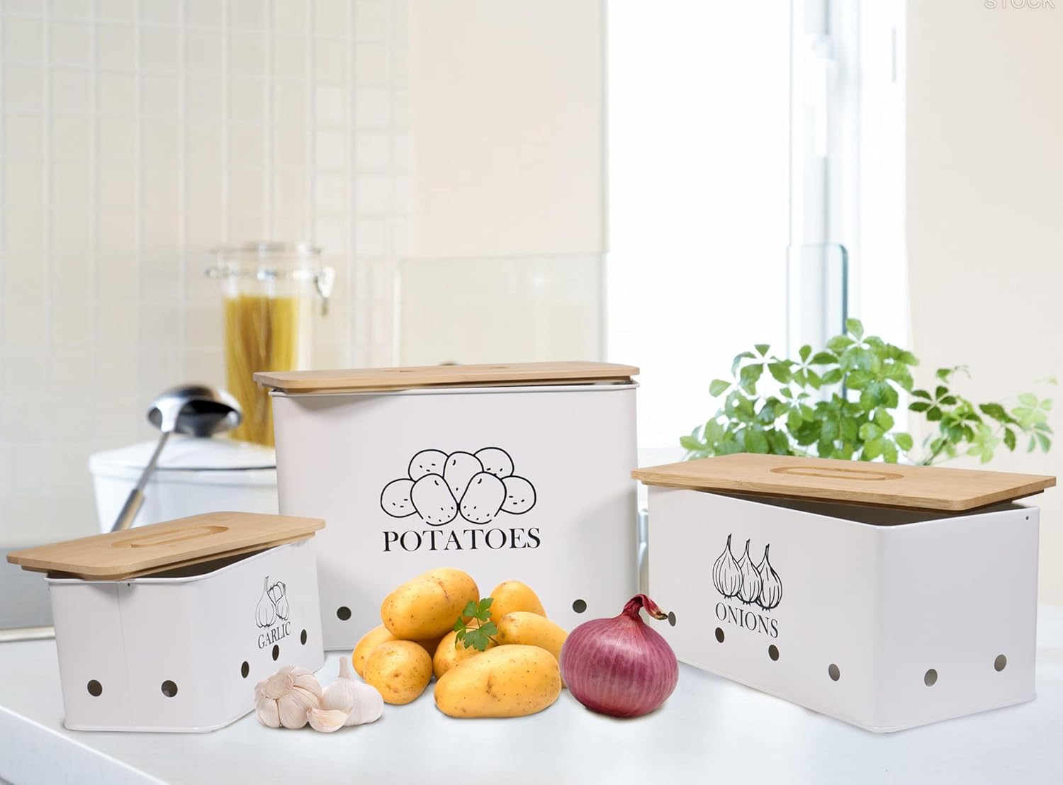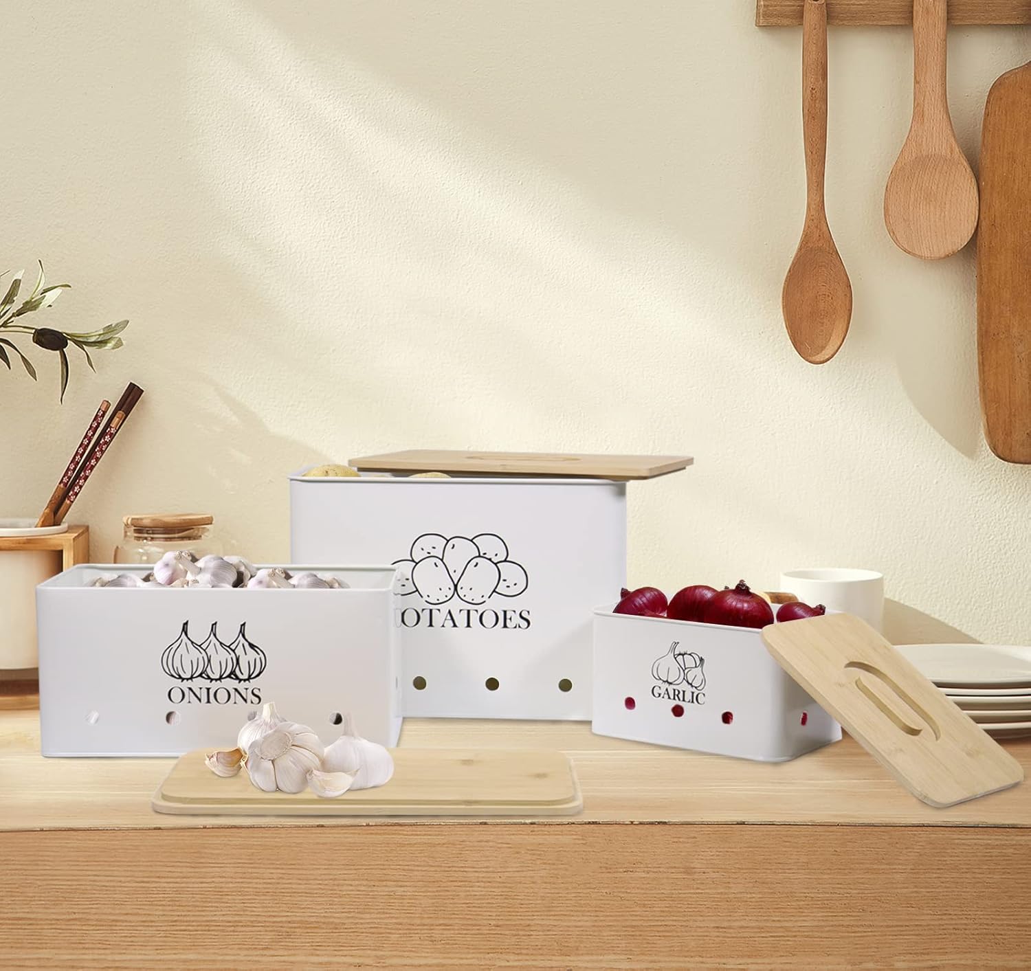 Kitchen Vegetable Storage Tins Set of 3 for Potato Onion & Garlic with Wooden Lid, Kitchen Storage Canisters Set, Long Shelf Life - White