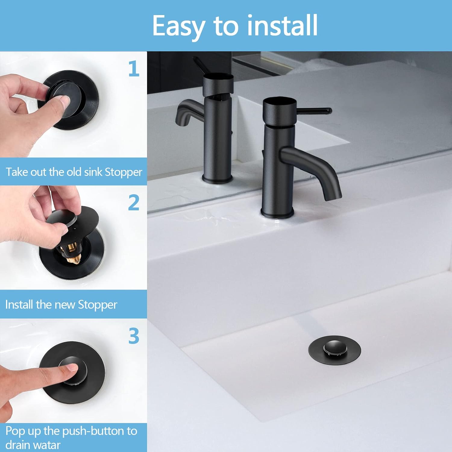 - 【PERFECT COMPATIBILITY】Black pop up drain stopper for bathroom sink is designed with a new small diameter (1.1~1.5 inch inner diameter), our 2 silicone rings ensure a perfect fit with various drain holes, conforming to most US standards 1 1 /8" ~1 1/2" sink drain holes (depth: about 1.5")Other similar products are too large for American sinks.