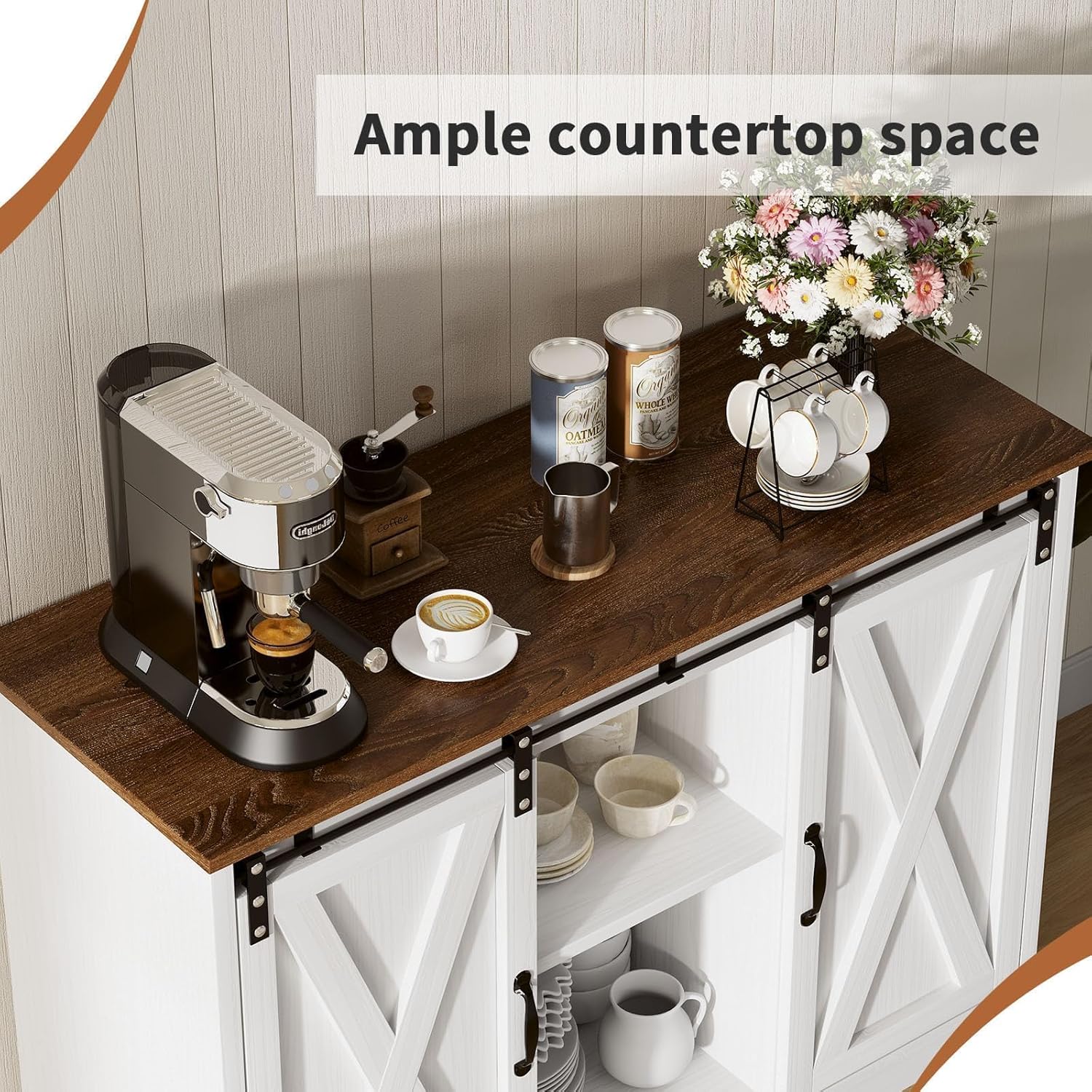 - CHOICE FOR LOVERS OF FARMHOUSE STYLE: Coffee bars has 2 sliding barn doors with black metal fittings. Charming white coffee station will fit in well with any home style, giving you a charming rustic feeling