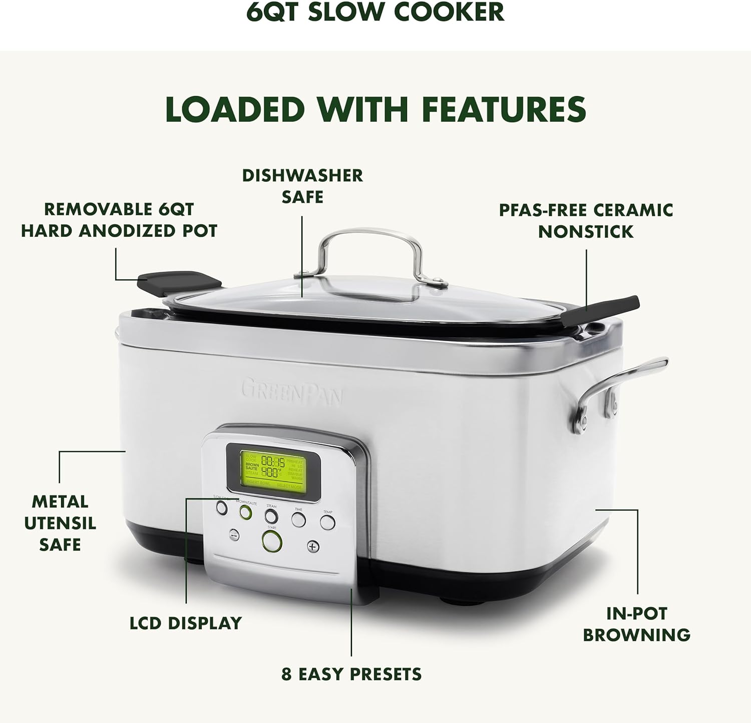 GreenPan Elite 8-in-1 Programmable 6QT Electric Slow Cooker, Dishwasher Safe Lid & Removable Crock, PFAS-Free Healthy Ceramic Nonstick Multi-Cooker, Sear, Sauté, Brown, Steam Basket, Roast, White