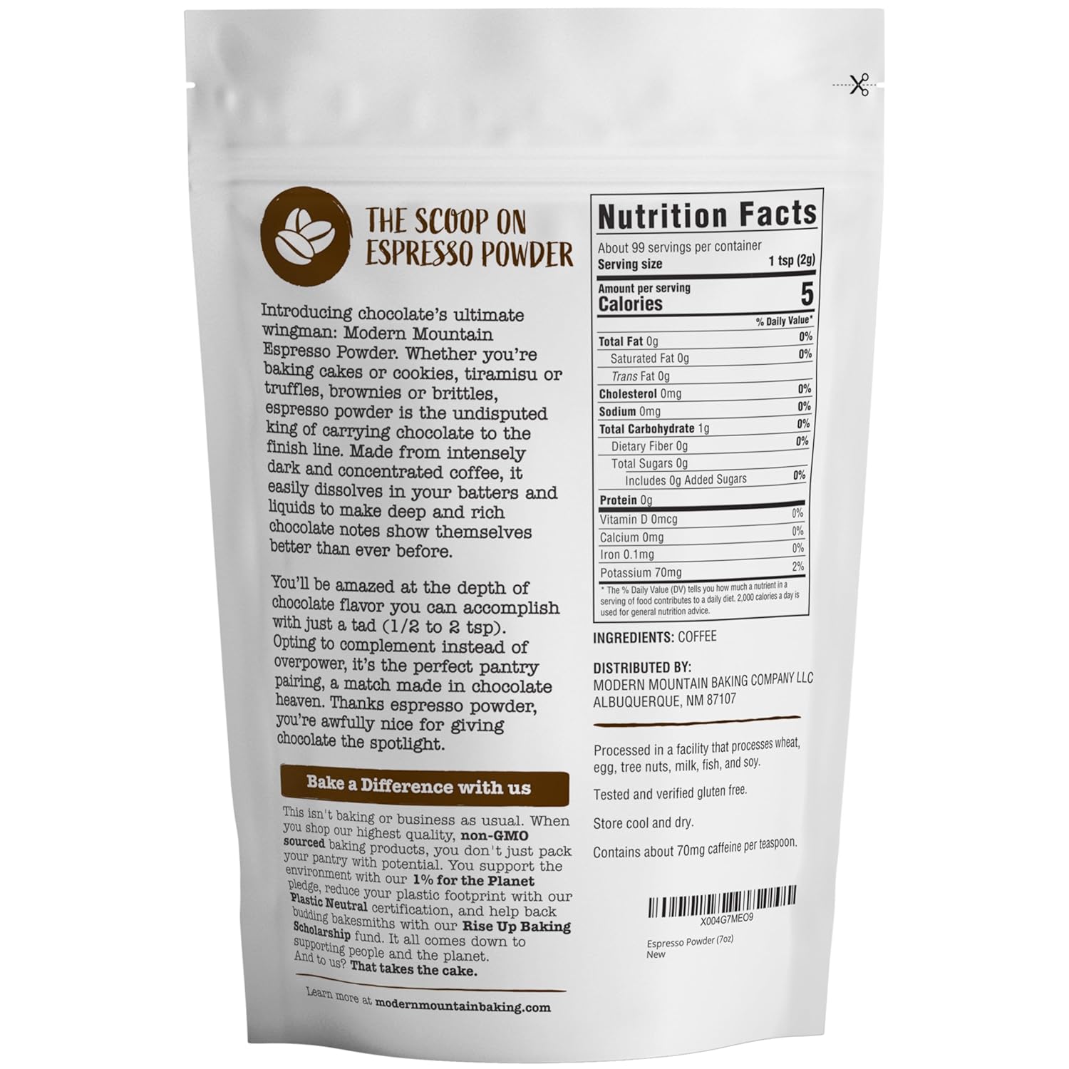 - ENHANCE THE CHOCOLATE FLAVOR OF YOUR BAKING: Introducing chocolate's ultimate wingman: Modern Mountain Espresso Powder for baking. It's a baker's best-kept secret for adding a new level of depth to chocolate baked goods. If you're a first-timer, we bet you'll be bewildered by just how much deeper of a chocolate flavor you can accomplish with a bit of espresso powder, all while adding little to no coffee taste.