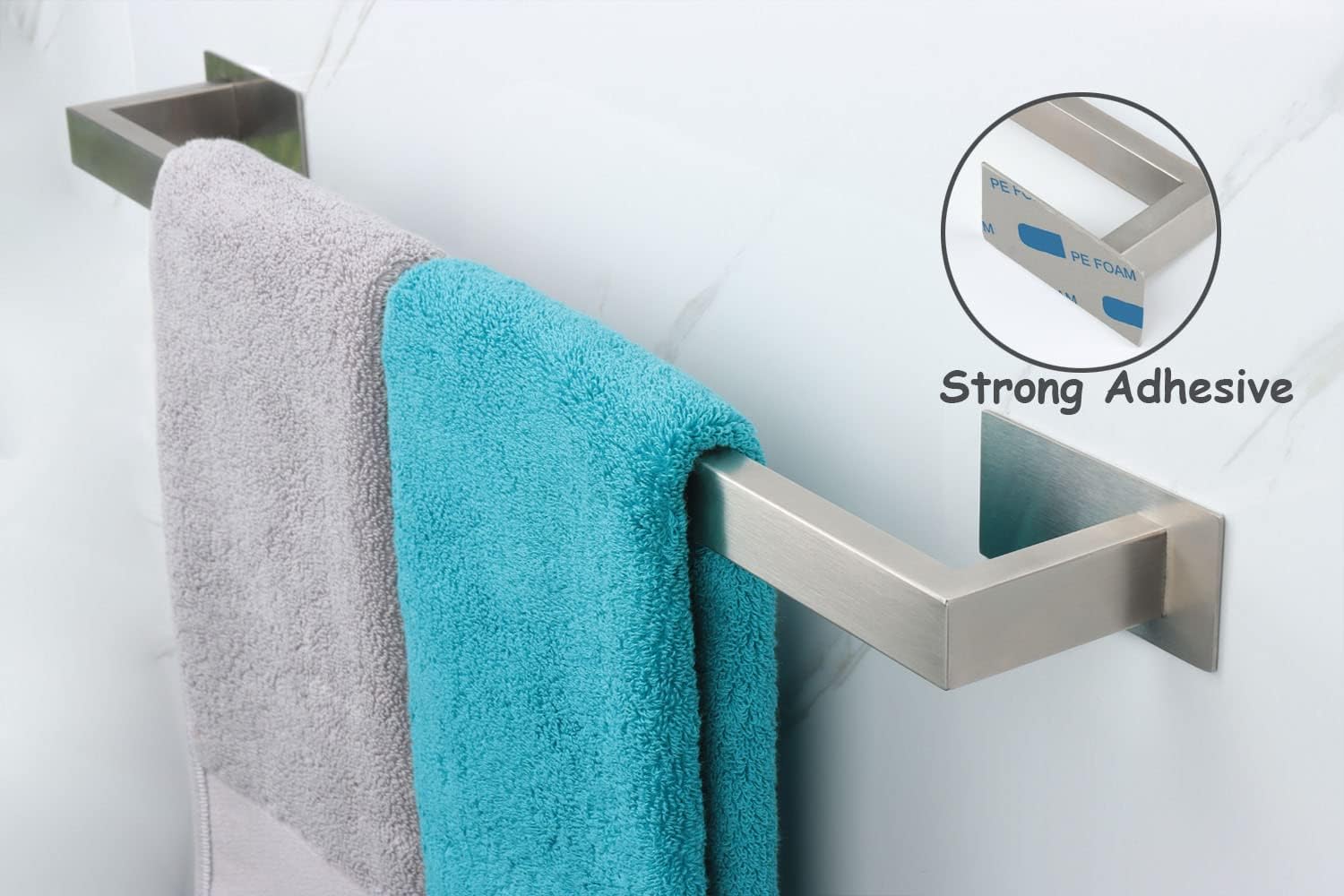 - STRONG ADHESIVE: Adhesive Towel bar has large area superglue, attached to the wall firmly. Through our repeated tests, the no-drill towel rod can hold up to 10 pounds. Provides durability for long time use. Unique round shape design, protect your hands from scratch and are safe for kids to use.