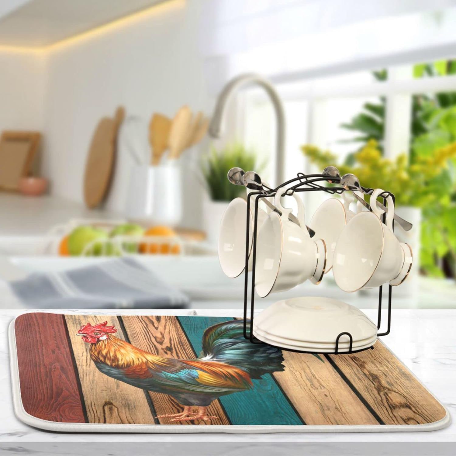 Rooster Dish Drying Mat for Kitchen Counter Farmhouse Absorbent Microfiber Drying Pad, Large 18x24 in, Reversible Drainer Mats