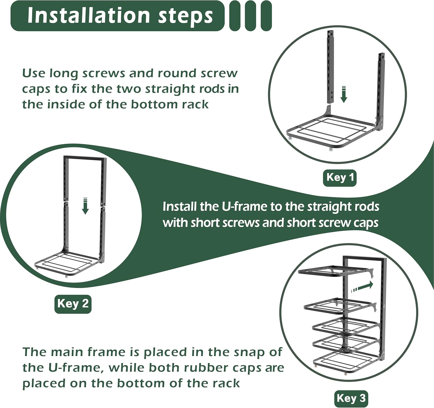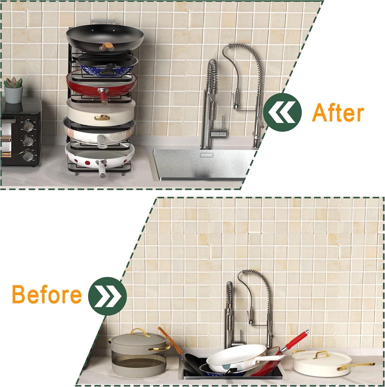 - 【Adjustable Design】Our 6-tier pan holder features a snap-on design that allows you to adjust the height of each tier at will. It can accommodate various sizes and shapes of pots and pans
