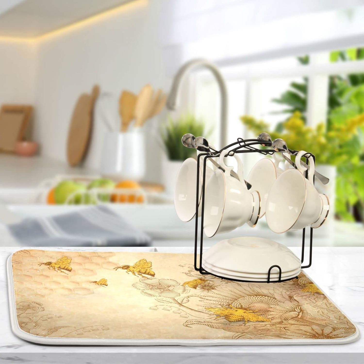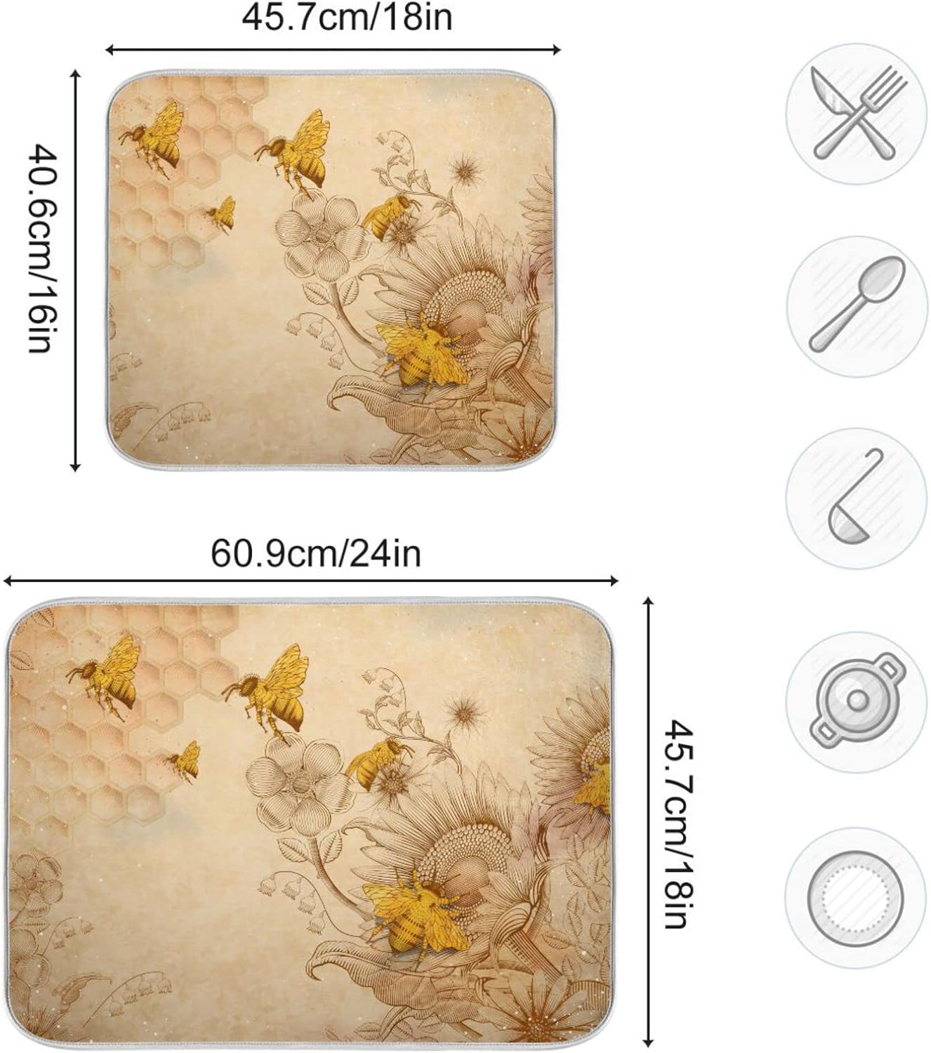 Super Absorbent Dish Drying Mat, Microfiber Fast-Drying Dish Mat, 24" x 18", Kitchen Dish Drying Pad, Sunflower Bee Retro
