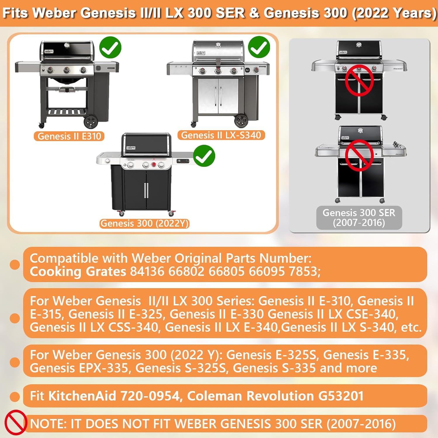 - Great for weber genesis 2 replacement grate & all genesis 2 300 series gas grills(2017 and newer): fit Weber Genesis II 300 Series gas grill, for Weber Genesis ii E-310, Genesis ii E-315, Genesis ii E-325, Genesis ii S-310, Genesis ii SE-310, Genesis ii E-330, Genesis ii SE-330, Genesis ii CE-330, Genesis ii S-335, Genesis ii SE-335, Genesis ii E-335, Genesis ii S-345.