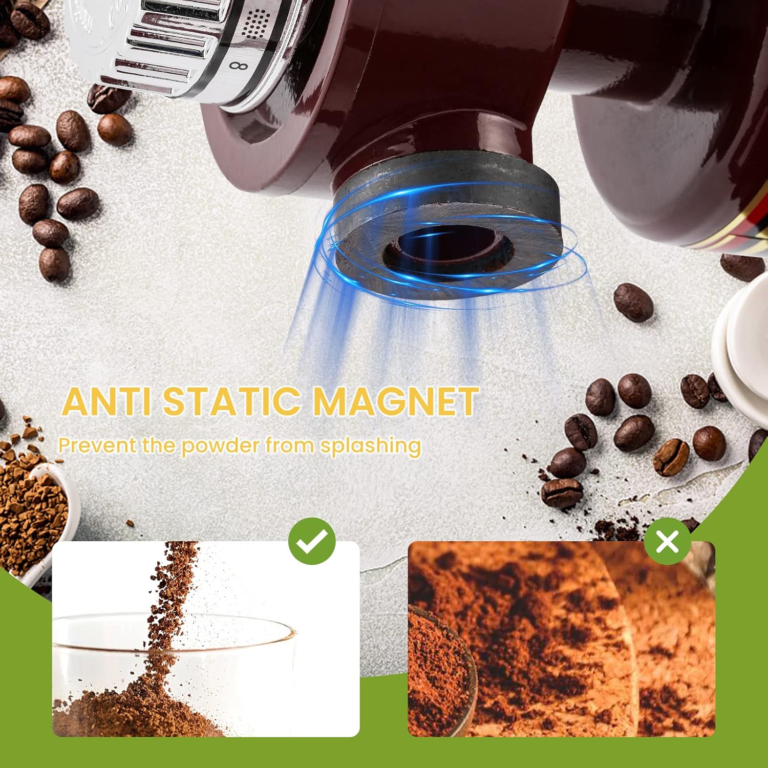 - Low Noise & Anti Static: This coffee bean grinder operates quietly, allowing you to enjoy it without disturbing others. The grinder's burr features a magnetic powder outlet that significantly prevents powder from scattering, keeping your countertop clean