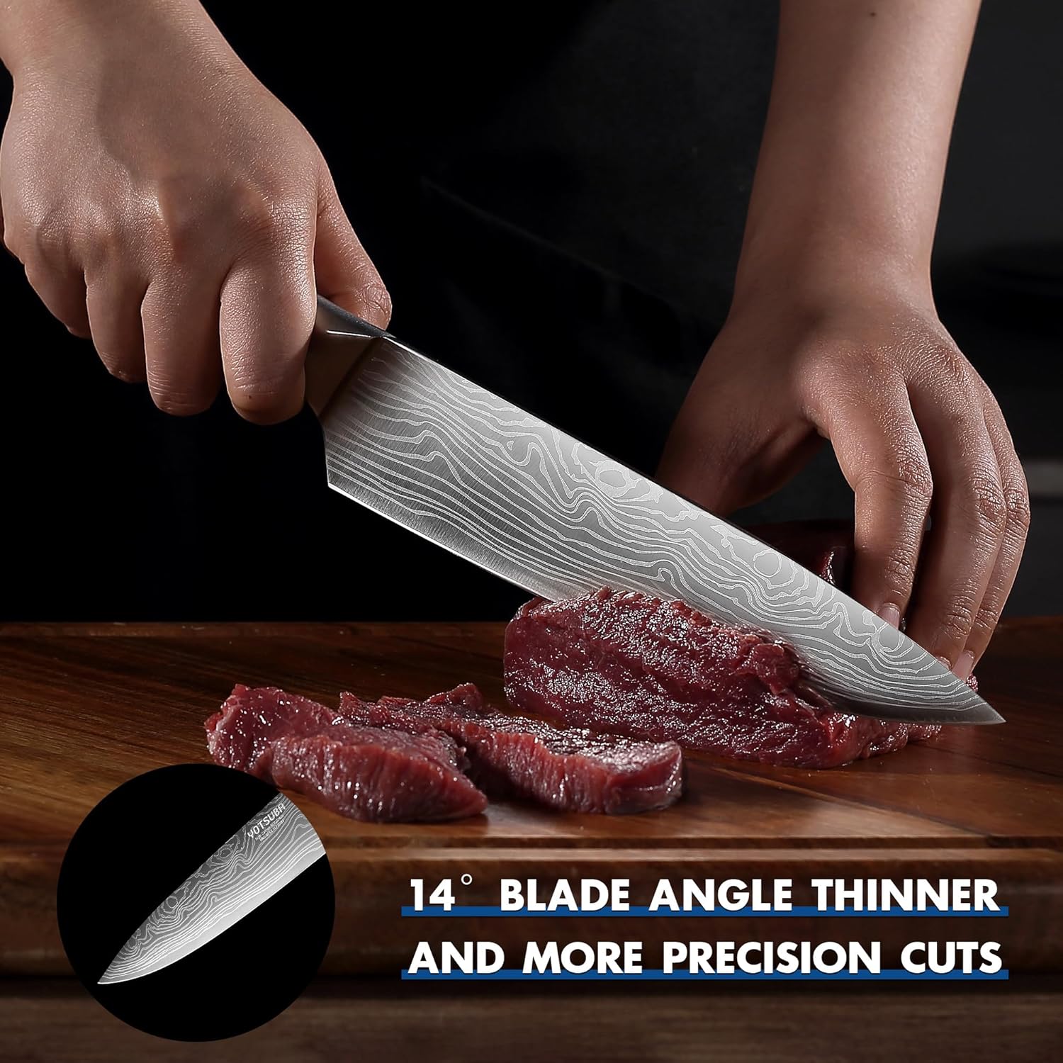 - ULTRA SHARP EDGE : These chef knife set are forged from 5Cr15Mov German steel, the carbon content is 0.5%, chef knife make the hardness to 56 Rockwell. With carefully sharpening by our professional craftsmen, the blade edge reached 14 degrees per side. The combination of maximum sharpness and edge retention ensures precise and effortless cutting every time