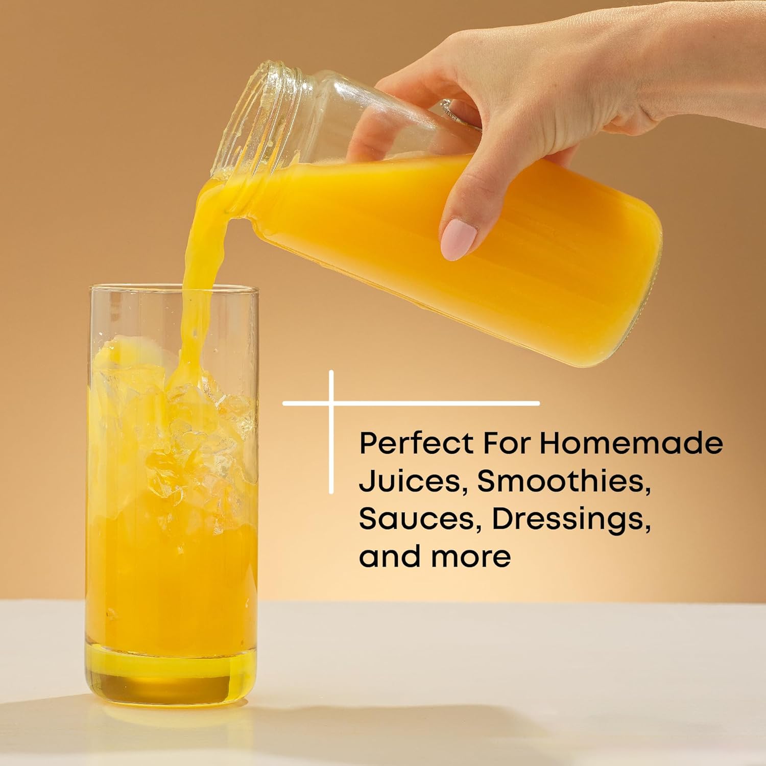 - GLASS BOTTLES FOR JUICING AND MORE! Iced coffee, cold brew bottles, milk, smoothie tumbler or orange juice glasses. Anything goes. Aloe Vera water containers? Yep. Iced Tea or Kombucha bottles? Also yes. Meal prep Gazpacho? Great idea! They’re glass storage bottles for liquids of any kind!