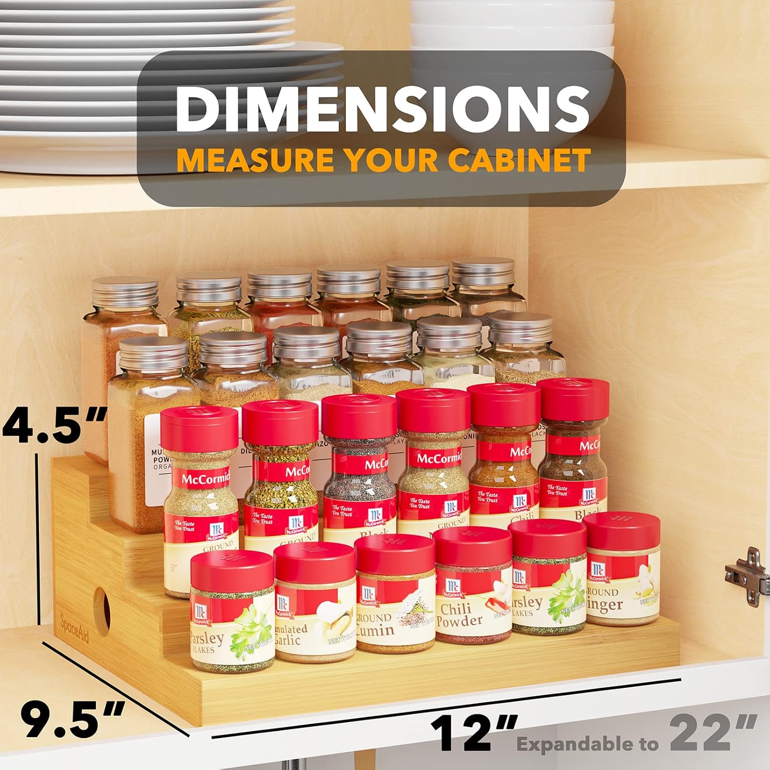 - EXPANDABLE SPICE SHELF - Keep your home clean and keep track of your spice jars better with this bamboo organizer holder; The spice rack is expandable and adjustable from 12" wide to 22" wide