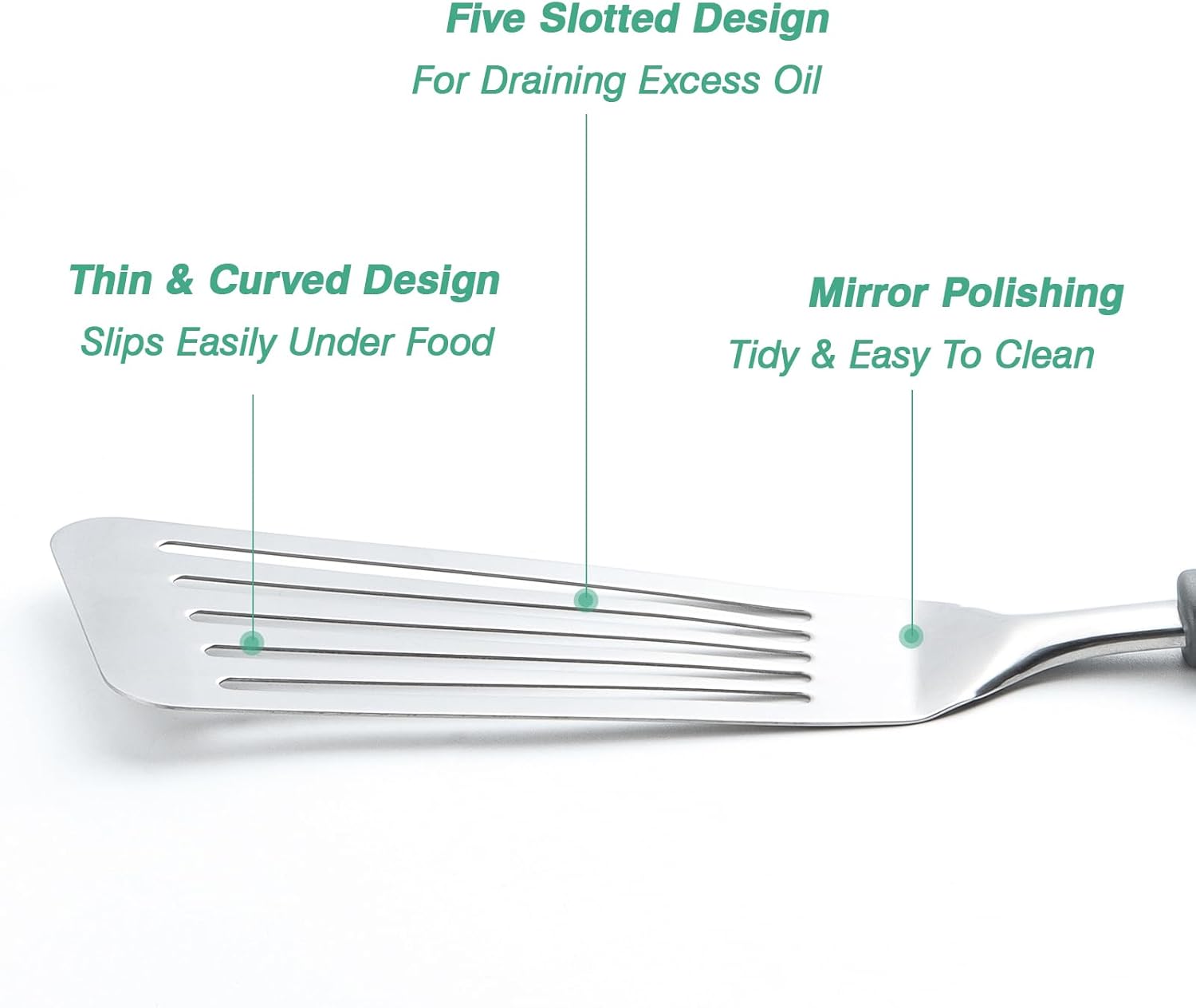 - 【Slotted Spatula Design】High-grade stainless steel spatula with drainage slots ideal for draining cooking liquids or oils of foods quickly. Less oil makes food healthier, and keep food clean & dry easily