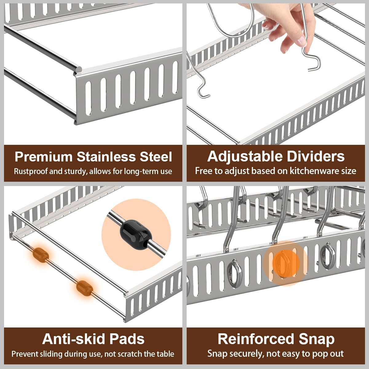 - Expandable Pot and Pan Organizer: Designed as expandable for storage such as heavy pans, large platters, cutting board and other bakeware. It can be used on a countertop, cabinet and even under the sink.