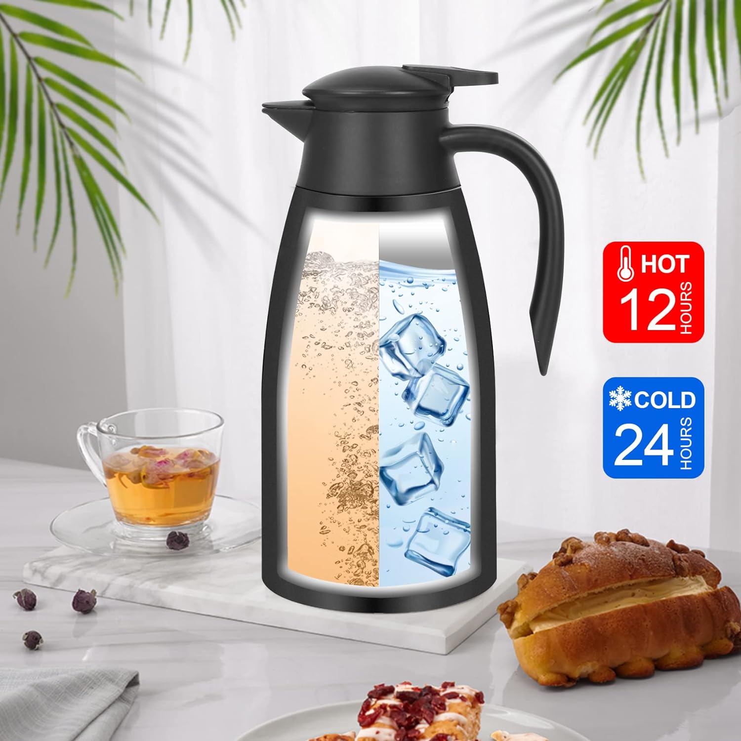 - 【 12HR WARM& 24HR COLD】This thermal carafe is made of double-wall stainless steel vacuum insulation, which allows for maximum temperature retention; keeps your beverage 12 hrs Heat retention or 24 hrs cold retention.