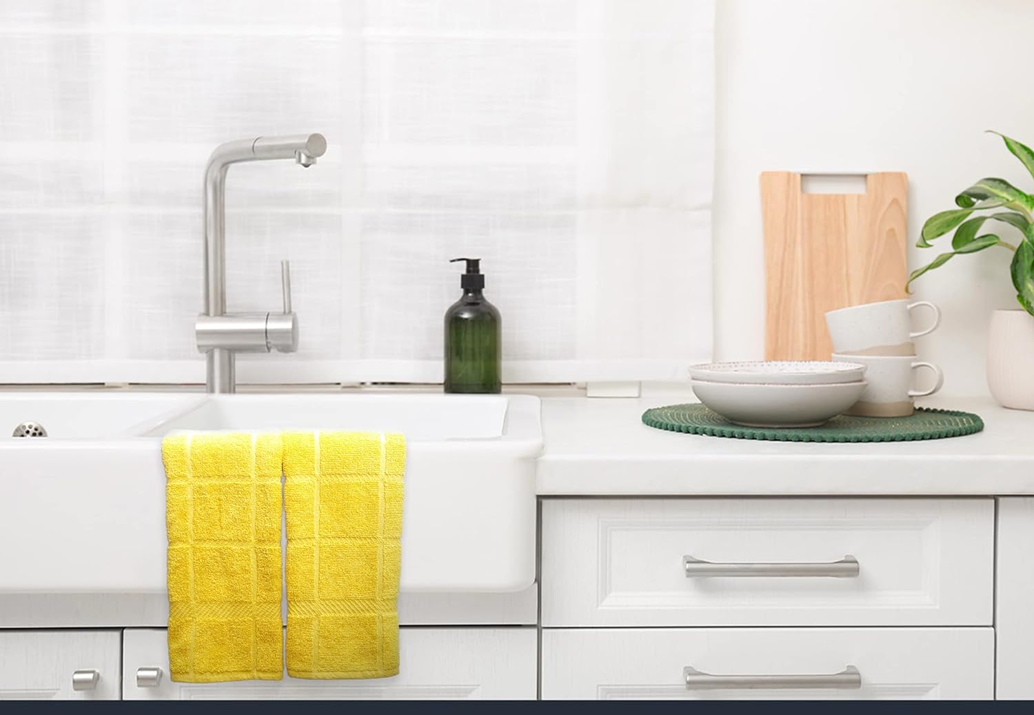 - Mellow buff dishcloths and dishtowels are made of 100% cotton with supreme quality and exquisite workmanship. Designs are simple, perfect size and it will give the feeling of being home by co-ordinating with most kitchen decor.