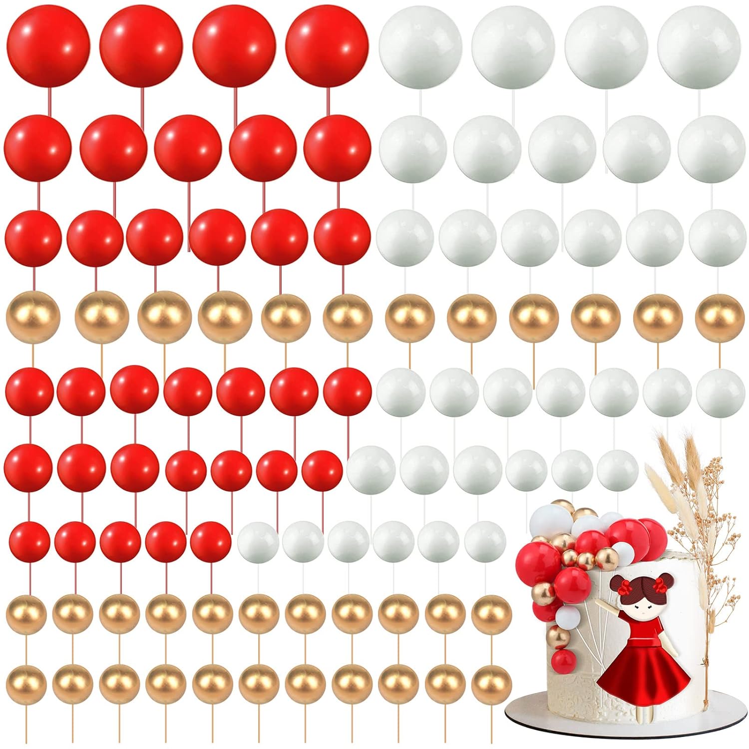 108 Pcs Balls Cake Topper DIY Cupcake Insert Foam Balloons for Cake Baking Wedding Anniversary Birthday Decoration(Red, White, Gold,Multi Sizes)