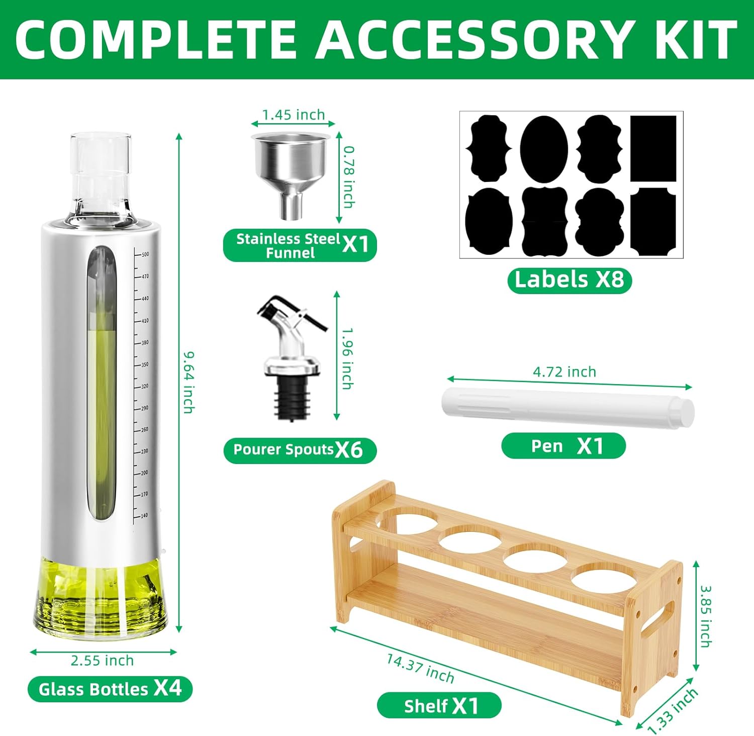 Oil Dispenser Bottle, 4 Pack Glass Olive Oil Dispenser Bottle with Shelf, 17oz/500 ml Oil and Vinegar Dispenser Set Wrapped in Stainless Steel Shell with Pourers, Funnel & Pen and Tags