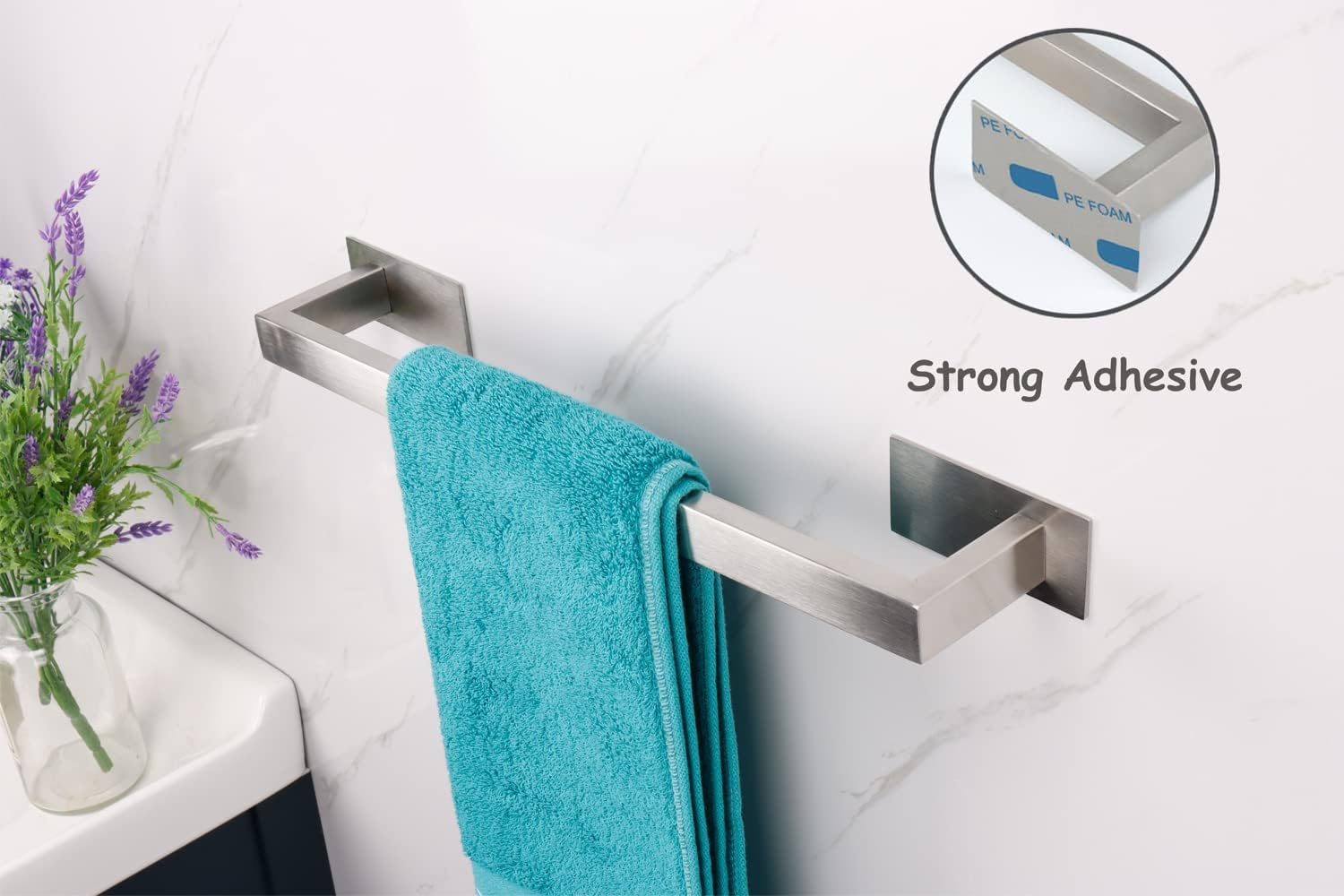 - STRONG ADHESIVE: Adhesive Towel bar has large area superglue, attached to the wall firmly. Through our repeated tests, the no-drill towel rod can hold up to 10 pounds. Provides durability for long time use. Unique square shape design, protect your hands from scratch and are safe for kids to use.