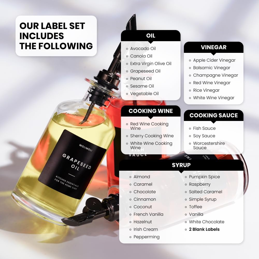 - Modern Kitchen Essential: Minimalism Inspired Cooking Oil Dispenser Bottle. This Set Includes Four High-quality 11.8 Oz (350 Ml) Glass Bottles, Four Black Pourers, a funnel, and a 37 Label Set.