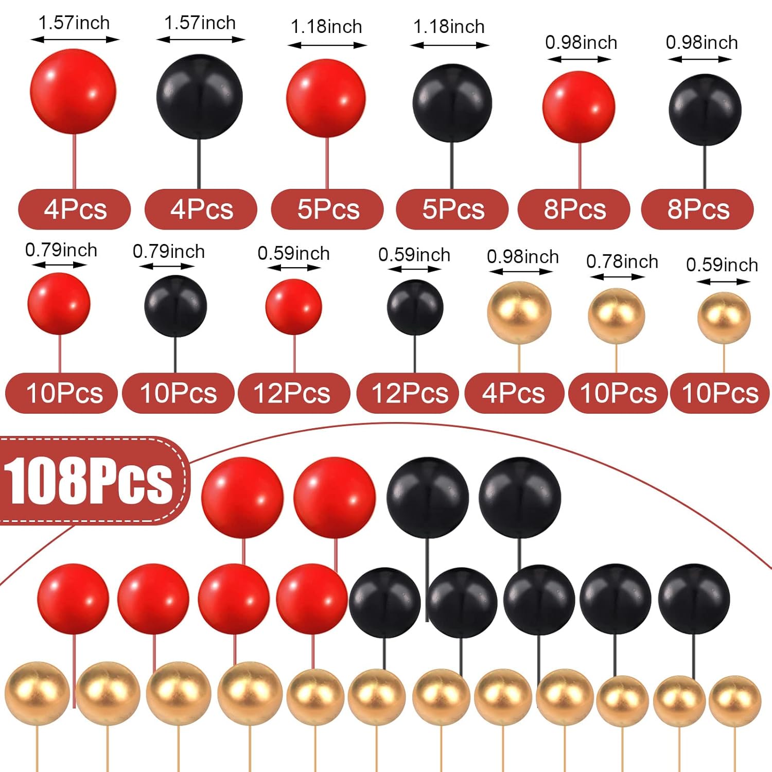108 Pcs Balls Cake Topper DIY Cupcake Insert Foam Balloons for Cake Baking Wedding Anniversary Birthday Decoration(Red, Black, Gold,Multi Sizes)
